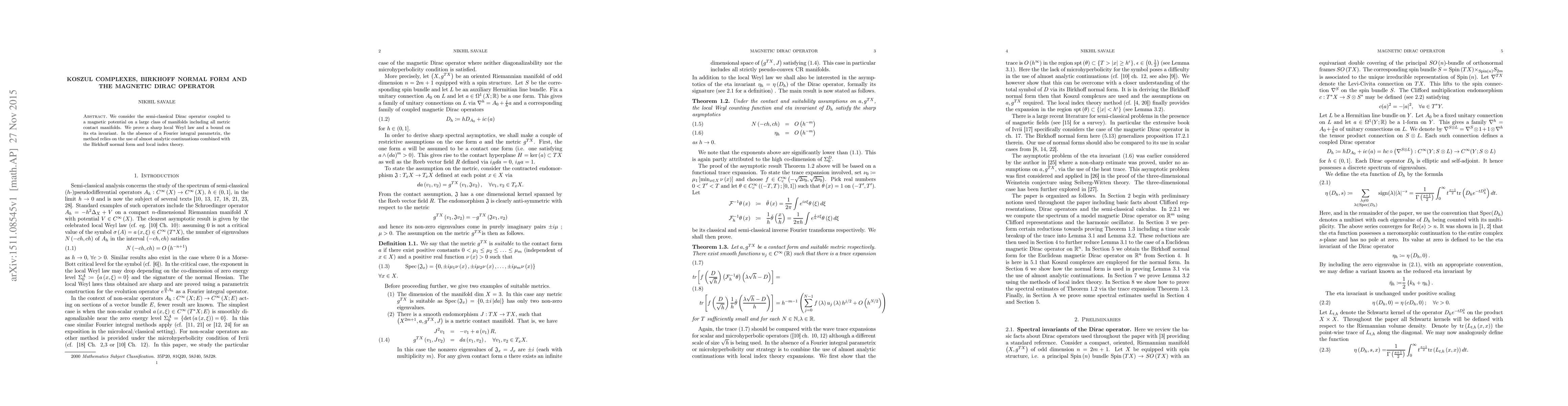 We consider the semi-classical Dirac operator coupled to a magnetic potential on a large class of manifolds including all metric contact manifolds. We prove a sharp local Weyl law and a bound on its eta invariant. In the absence of a Fourier integral parametrix, the method relies on the use of almost analytic continuations combined with the Birkhoff normal form and local index theory.