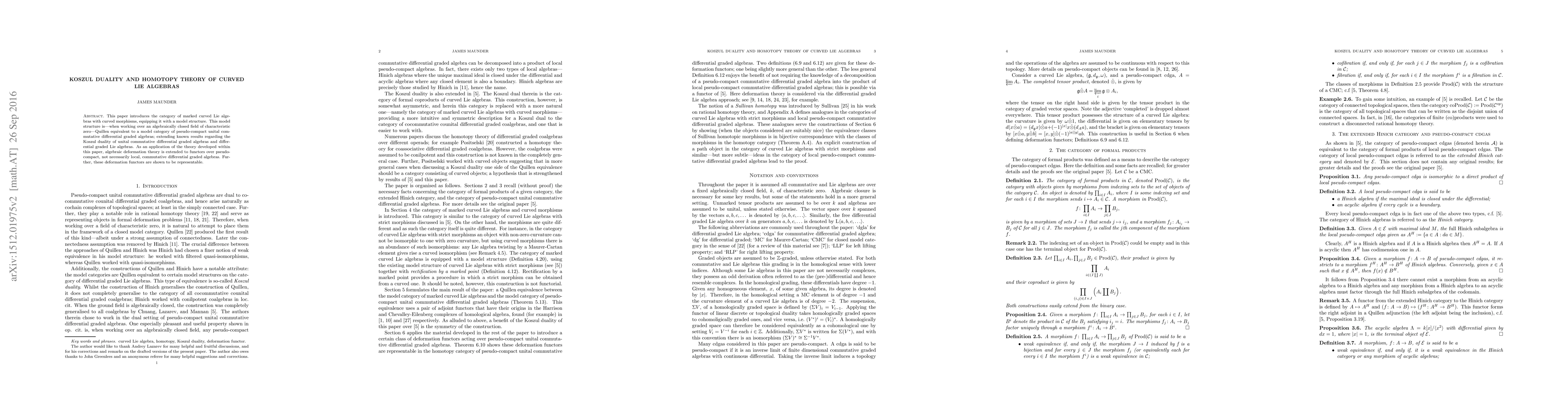 This paper introduces the category of marked curved Lie algebras with curved morphisms, equipping it with a closed model category structure. This model structure is---when working over an algebraically closed field of characteristic zero---Quillen equivalent to a model category of pseudo-compact unital commutative differential graded algebras; this extends known results regarding the Koszul duality of unital commutative differential graded algebras and differential graded Lie algebras. As an application of the theory developed within this paper, algebraic deformation theory is extended to functors on pseudo-compact, not necessarily local, commutative differential graded algebras.