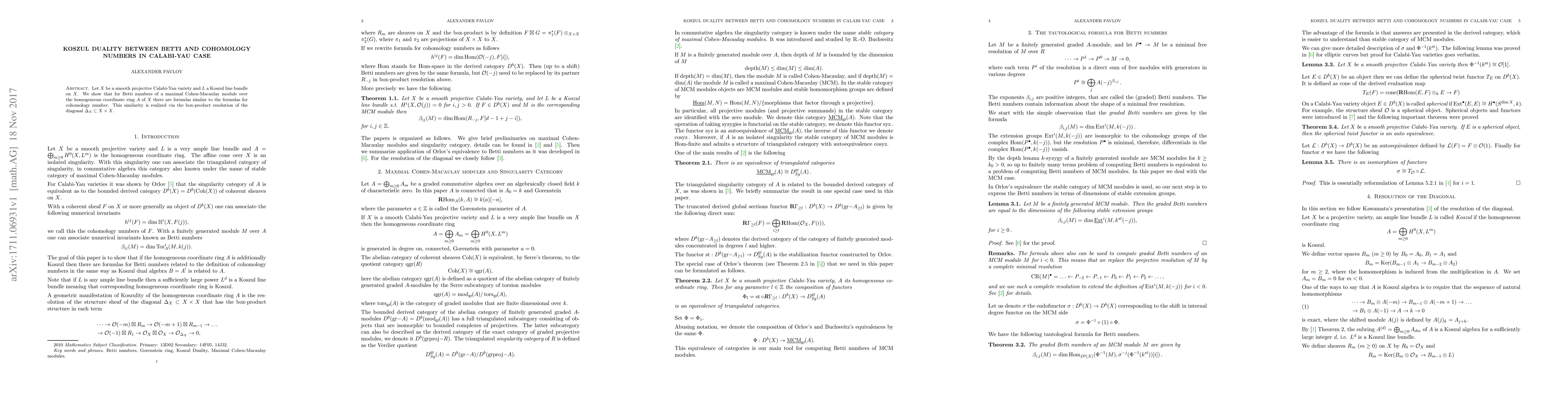 This research demonstrates a Koszul duality between Betti and cohomology numbers in smooth projective Calabi-Yau varieties, using the box-product resolution of the diagonal to establish similar formulas for Betti numbers of maximal Cohen-Macaulay modules as those for cohomology numbers.