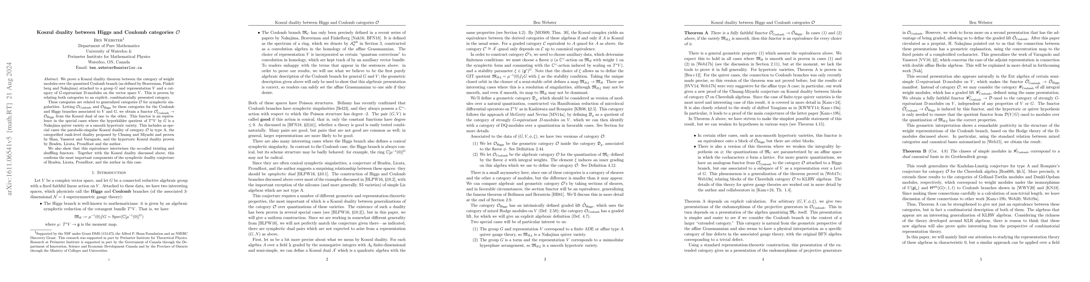 This paper proves a Koszul duality theorem between Higgs and Coulomb categories $\mathcal{O}$, establishing a functor equivalence in special cases, and confirming key components of the symplectic duality conjecture. The equivalence intertwines twisting and shuffling functors, connecting quantized Coulomb branch modules and $G$-equivariant D-modules.