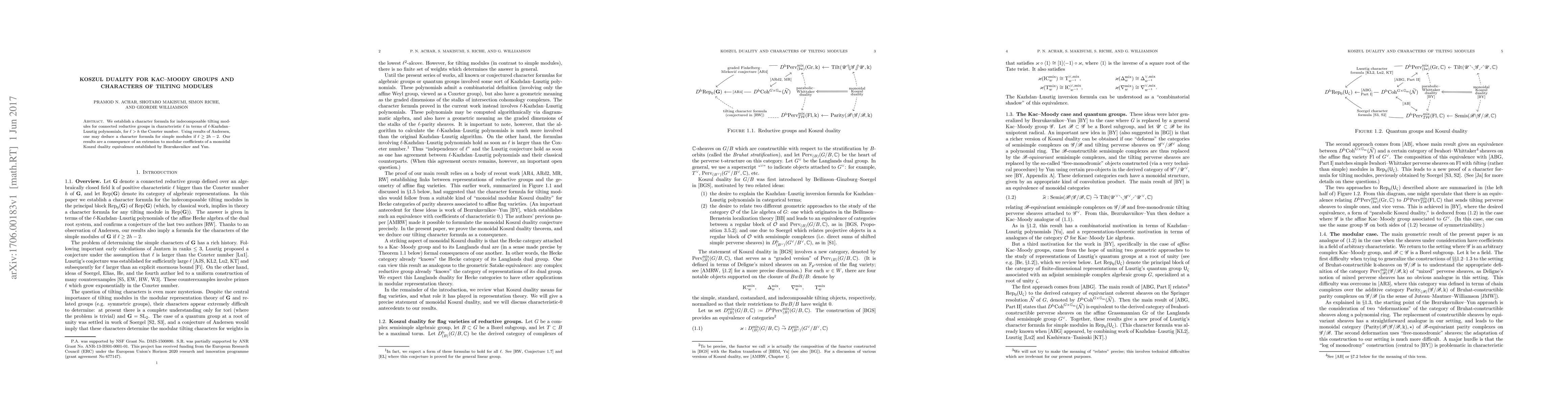 This paper establishes a character formula for indecomposable tilting modules in positive characteristic using p-Kazhdan-Lusztig polynomials, extending a Koszul duality equivalence to modular coefficients. It also deduces a character formula for simple modules under certain conditions.