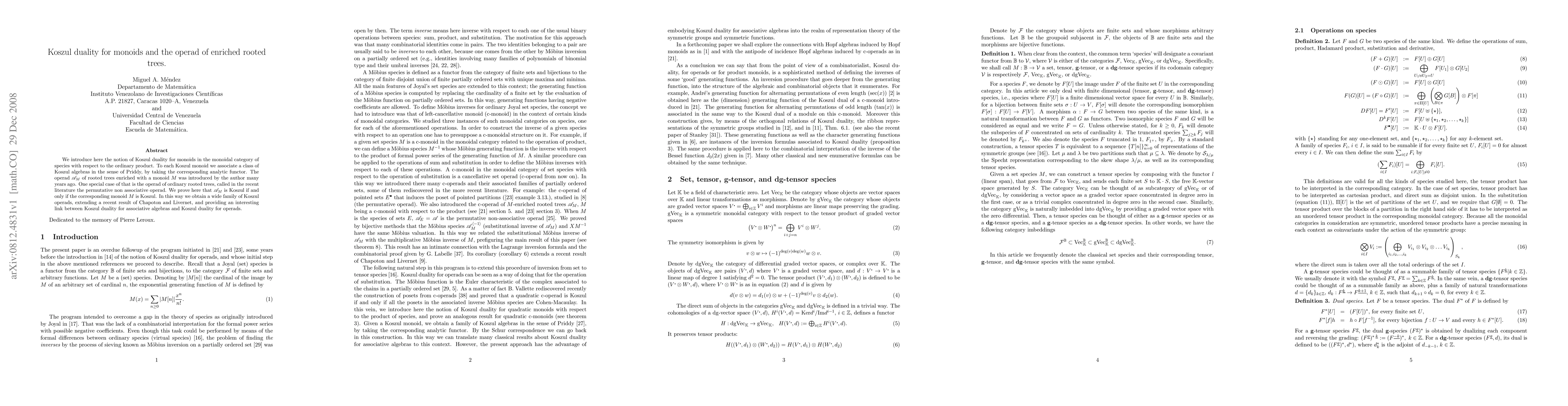 The paper develops the concept of Koszul duality for monoids in species and establishes a criterion for when the associated operad of enriched rooted trees is Koszul.