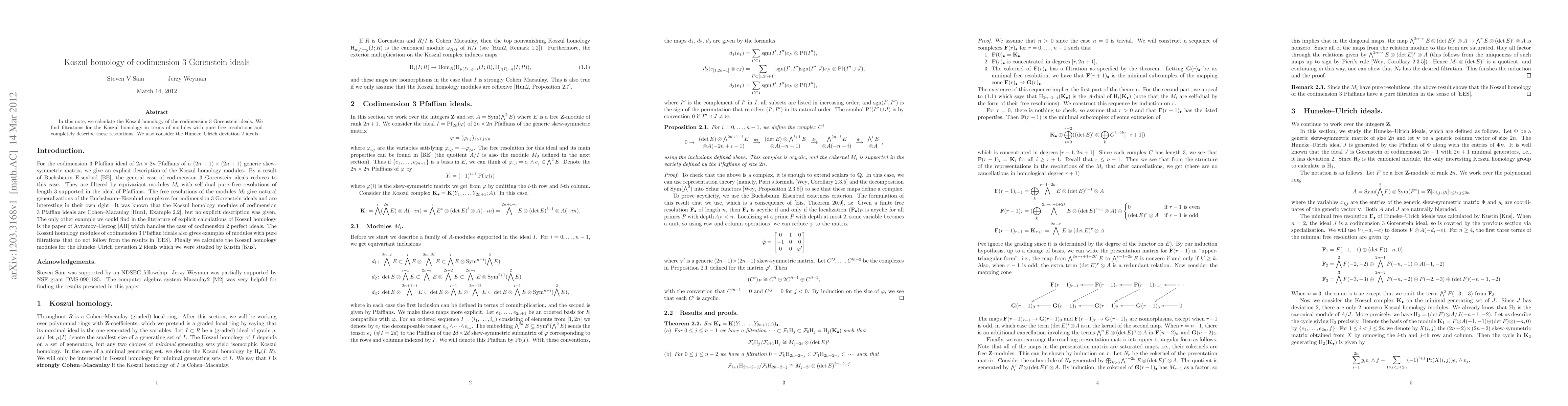 This paper calculates the Koszul homology for codimension 3 Gorenstein ideals, providing filtrations based on modules with pure free resolutions and detailing these resolutions. It also examines Huneke-Ulrich deviation 2 ideals.