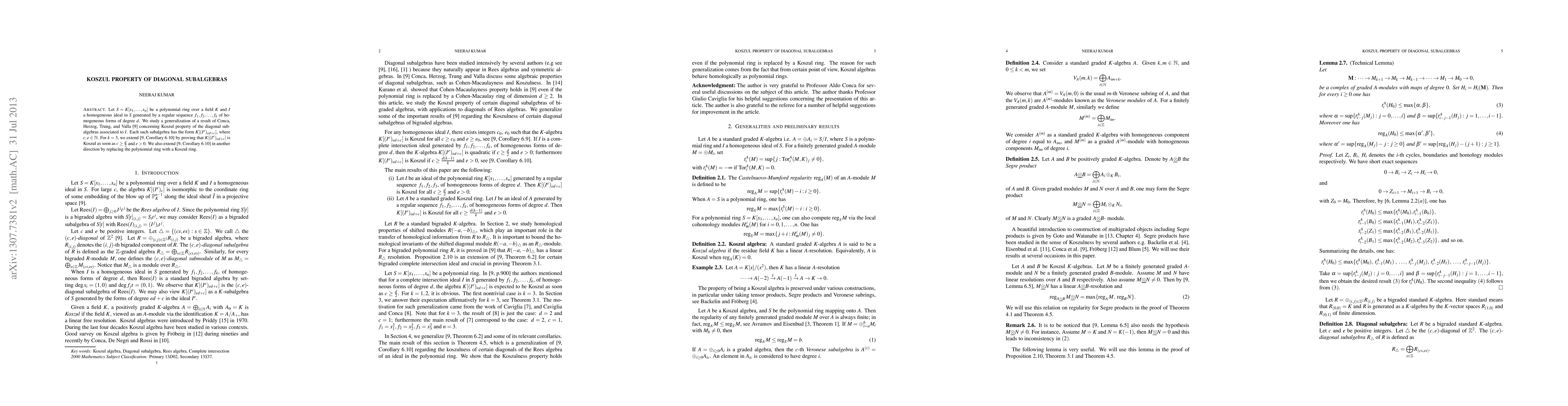 This paper studies the Koszul property of diagonal subalgebras associated with a homogeneous ideal generated by a regular sequence in a polynomial ring. For k=3, it extends prior work by proving the Koszul property for subalgebras when a certain condition on the parameters is met, and it generalizes the setting by considering Koszul rings instead of polynomial rings.
