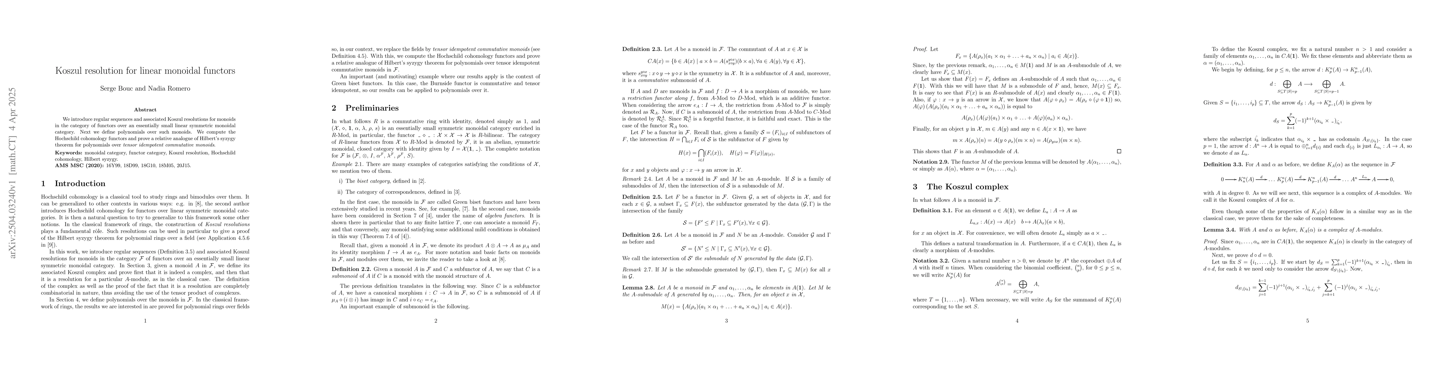 The paper introduces regular sequences and Koszul resolutions for monoids in the category of functors over a linear symmetric monoidal category, defining polynomials over such monoids and computing Hochschild cohomology functors.