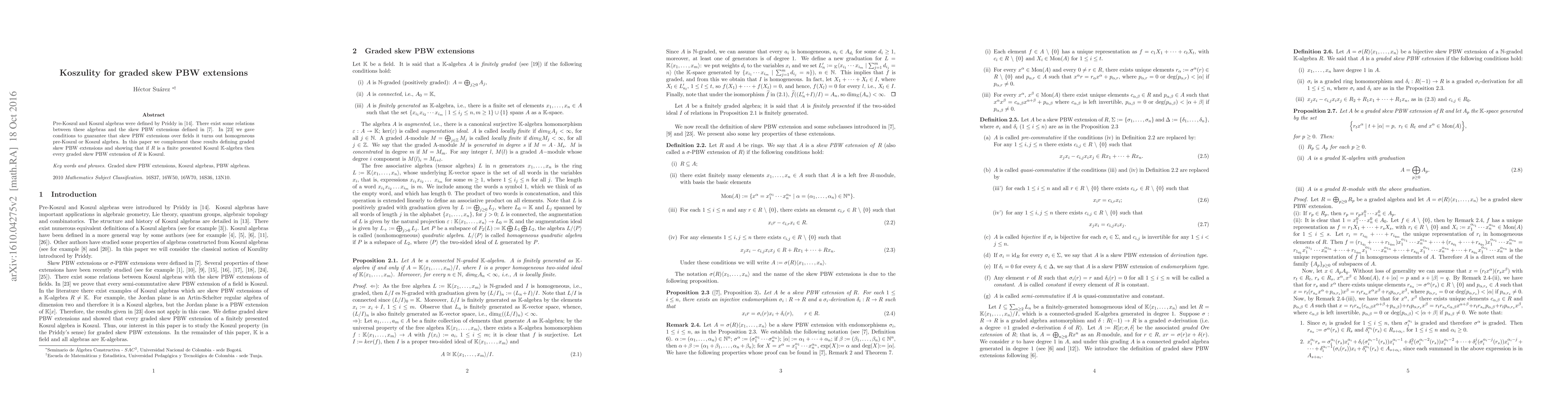 This paper explores graded skew PBW extensions, establishing conditions under which they become homogeneous pre-Koszul or Koszul algebras, and proves that any graded skew PBW extension of a finite presented Koszul algebra R remains Koszul.