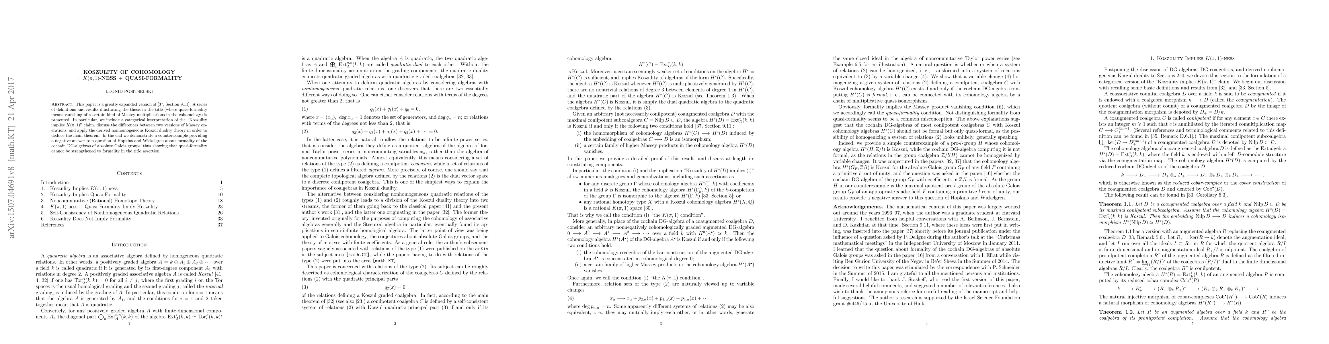 This paper expands on the concept that Koszulity in cohomology equals $K(\pi,1)$-ness plus quasi-formality, illustrating various definitions and results, including a categorical interpretation of the "Koszulity implies $K(\pi,1)$" claim and demonstrating a counterexample that disproves a conjecture about the formality of cochain DG-algebras of absolute Galois groups.