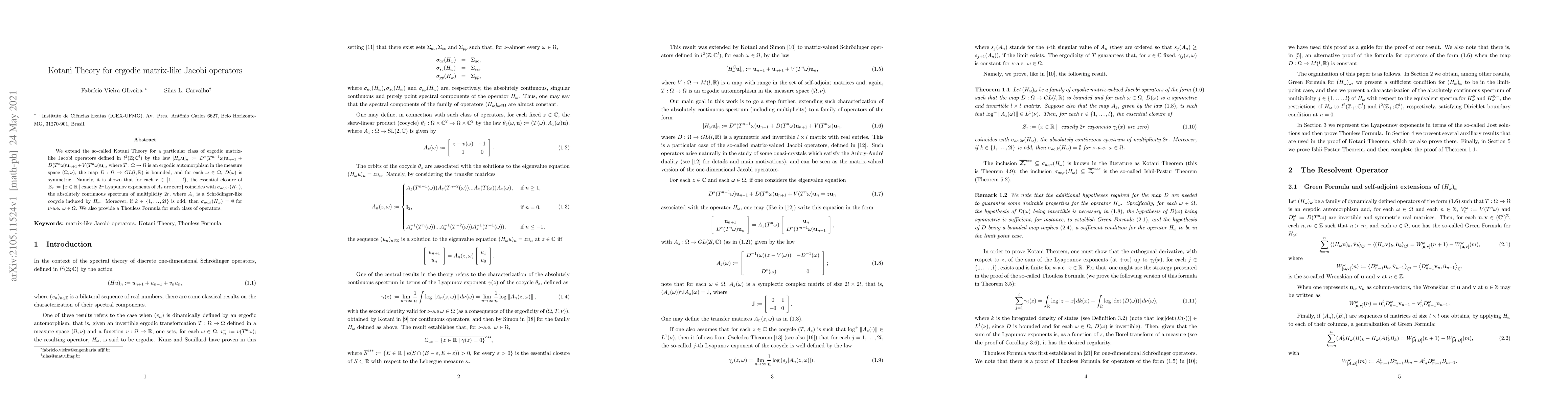 We extend the so-called Kotani Theory for a particular class of ergodic matrix-like Jacobi operators defined in $l^{2}(\mathbb{Z}; \mathbb{C}^{l})$ by the law $[H_{\omega} \textbf{u}]_{n} := D^{*}(T^{n - 1}\omega) \textbf{u}_{n - 1} + D(T^{n}\omega) \textbf{u}_{n + 1} + V(T^{n}\omega) \textbf{u}_{n}$, where $T: \Omega \rightarrow \Omega$ is an ergodic automorphism in the measure space $(\Omega, \nu)$, the map $D: \Omega \rightarrow GL(l, \mathbb{R})$ is bounded, and for each $\omega\in\Omega$, $D(\omega)$ is symmetric. Namely, it is shown that for each $r\in\{1,\ldots,l\}$, the essential closure of $\mathcal{Z}_{r} := \{x \in \mathbb{R}\mid$ exactly $2r$ Lyapunov exponents of $A_z$ are zero$\}$ coincides with $\sigma_{ac,2r}(H_{\omega})$, the absolutely continuous spectrum of multiplicity $2r$, where $A_z$ is a Schr\"odinger-like cocycle induced by $H_\omega$. Moreover, if $k\in\{1,\ldots,2l\}$ is odd, then $\sigma_{ac,k}(H_{\omega})=\emptyset$ for $\nu$-a.e. $\omega\in\Omega$. We also provide a Thouless Formula for such class of operators.