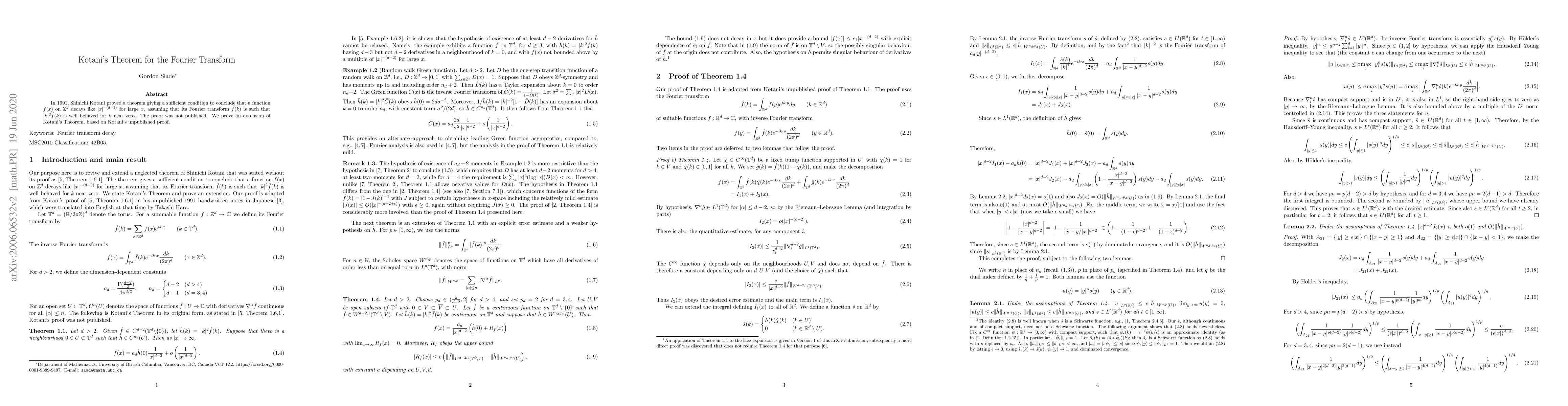 In 1991, Shinichi Kotani proved a theorem giving a sufficient condition to conclude that a function $f(x)$ on ${\mathbb Z}^d$ decays like $|x|^{-(d-2)}$ for large $x$, assuming that its Fourier transform $\hat f(k)$ is such that $|k|^{2}\hat f(k)$ is well behaved for $k$ near zero. The proof was not published. We prove an extension of Kotani's Theorem, based on Kotani's unpublished proof.