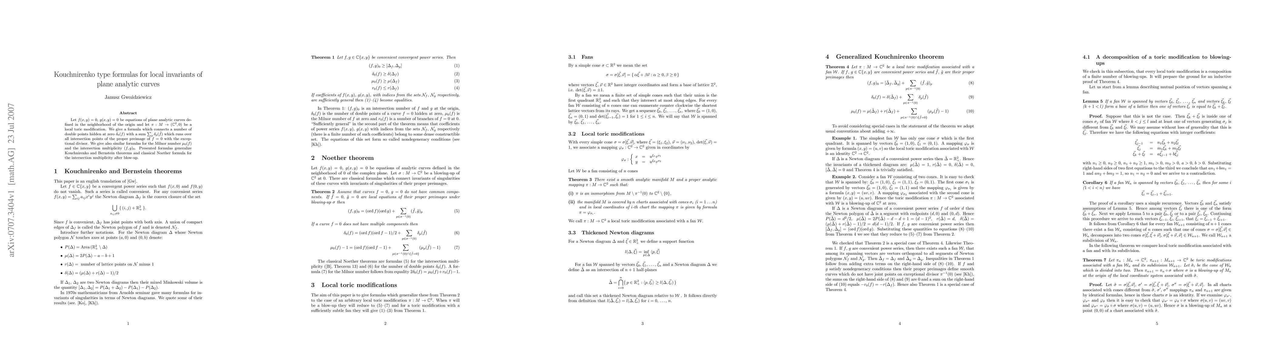Let f(x,y)=0 be an equation of plane analytic curve defined in the neighborhood of the origin and let $\pi:M\to(\Cn^2,0)$ be a local toric modification. We give a formula which connects a number of double points \delta_0(f)$ with a sum $\sum_p \delta_p(\tilde f)$ which runs over all intersection points of the proper preimage of f=0 with the exceptional divisor.