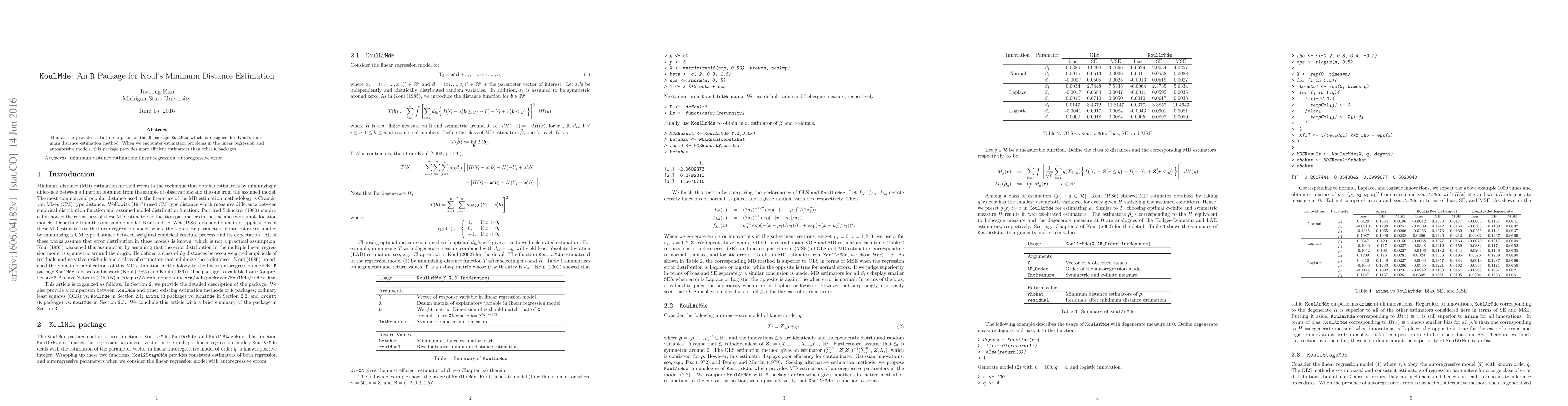 Summary: KoulMde is an R package for implementing Koul's minimum distance estimation method, offering more efficient estimators for linear regression and autogressive models compared to other R packages. It enhances estimation accuracy in these statistical models.