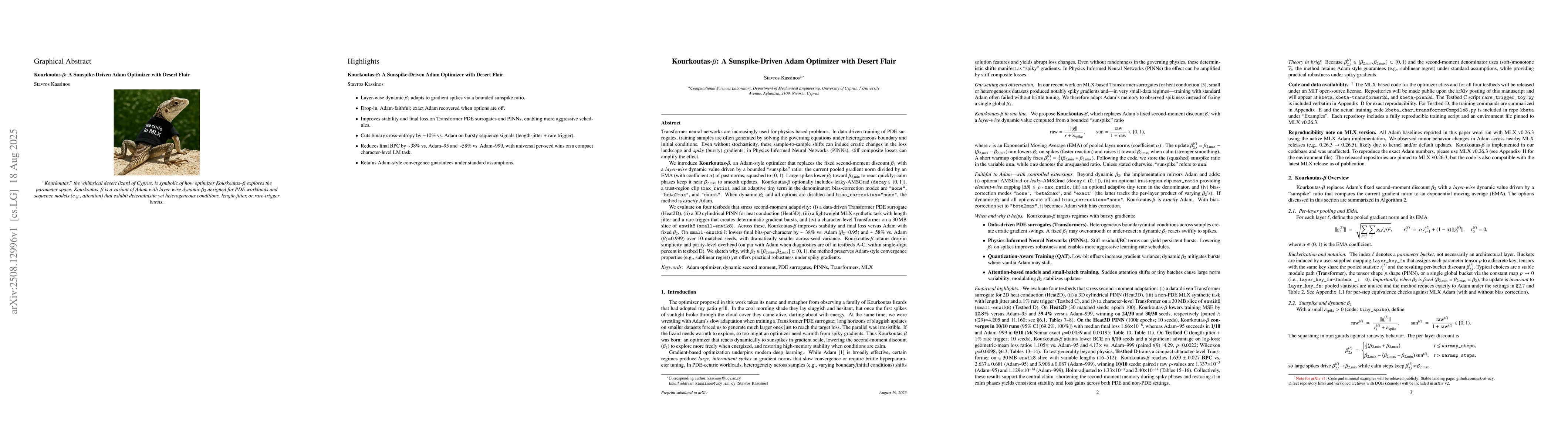 Transformer neural networks are increasingly used for physics-based problems. In data-driven PDE surrogates, training samples from varying boundary and initial conditions can cause erratic losses and spiky gradients; in physics-informed neural networks (PINNs), stiff composite losses amplify this effect. We introduce Kourkoutas-Beta, an Adam-style optimizer where the fixed second-moment discount beta2 is replaced by a layer-wise dynamic value driven by a bounded ``sunspike'' ratio: the current pooled gradient norm divided by an exponential moving average (EMA) of past norms, squashed to the interval [0,1). Spikes lower beta2 toward beta2_min; calm phases keep it near beta2_max. Options include leaky-AMSGrad (decay), trust-region clipping (max_ratio), adaptive tiny terms, and several bias-correction modes ``none'', ``beta2max'', ``exact'). With all features off and bias_correction=``none'', the method is exactly Adam. We test on four settings: (i) a Transformer PDE surrogate (Heat2D), (ii) a 3D PINN for heat conduction (Heat3D), (iii) a lightweight MLX synthetic task with jitter and rare-trigger bursts, and (iv) a character-level Transformer on 30 MB of enwik8 (small-enwik8). Kourkoutas-Beta improves stability and final loss versus fixed-beta2 Adam. On small-enwik8 it lowers bits-per-character by about 38% vs Adam-0.95 and about 58% vs Adam-0.999 over 10 seeds, with smaller variance. The method remains drop-in, with runtime overhead comparable to Adam in testbeds A-C and within single-digit percent in testbed D. It preserves Adam-style convergence guarantees while improving robustness under spiky gradients.