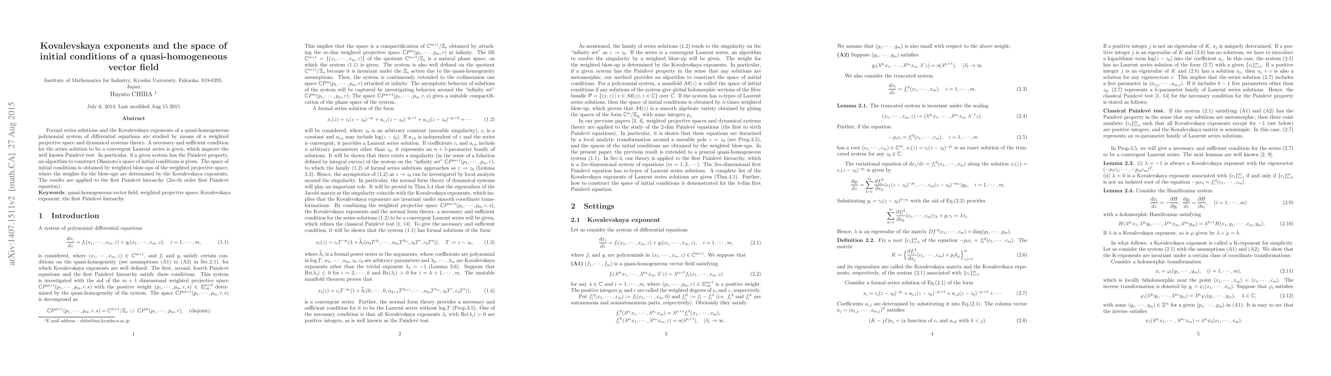 This paper studies quasi-homogeneous vector fields using dynamical systems theory and weighted projective spaces to analyze formal series solutions and Kovalevskaya exponents. It provides a necessary condition for series convergence and an algorithm to construct the space of initial conditions, particularly for the first Painlevé hierarchy.