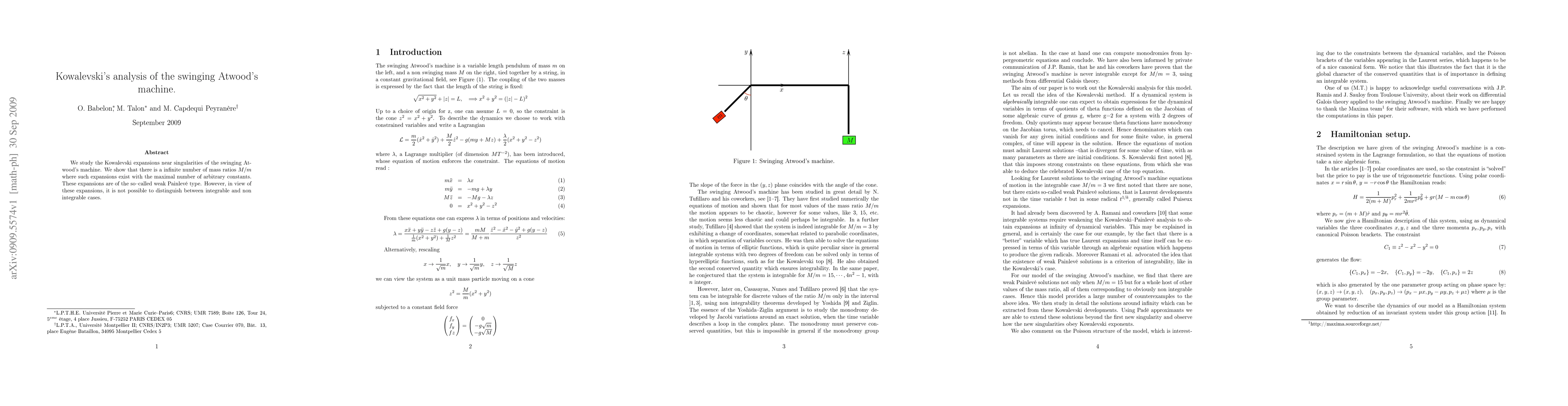 Summary: Kowalevski expansions for the swinging Atwood's machine reveal an infinite number of mass ratios allowing maximal arbitrary constants, indicating a weak Painlevé type. However, these expansions do not help differentiate between integrable and non-integrable cases.