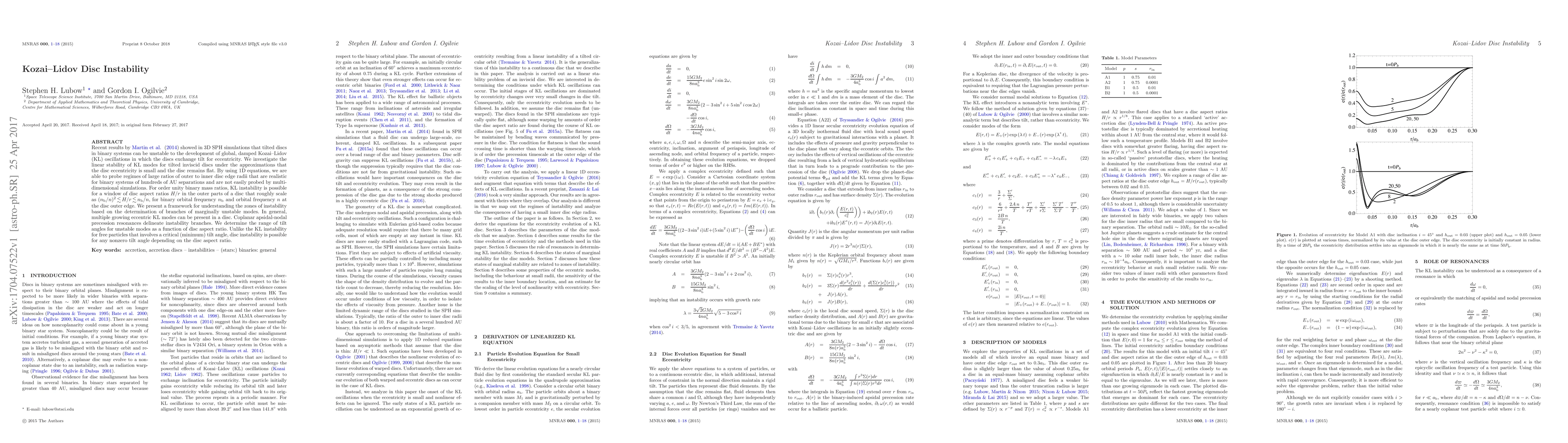 This paper investigates the linear stability of tilted, inviscid discs in binary systems, revealing that they can experience global, damped Kozai-Lidov oscillations. It identifies conditions for instability based on disc aspect ratios and the presence of multiple growing eccentric modes, showing that unlike free particles, any nonzero tilt angle can lead to instability depending on the disc's structural properties.