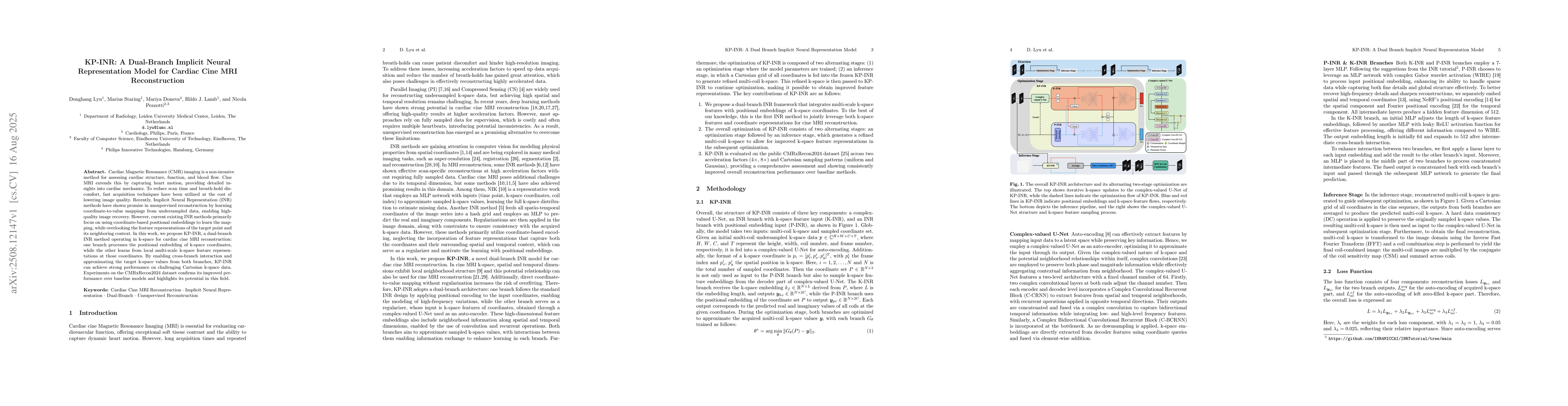 Cardiac Magnetic Resonance (CMR) imaging is a non-invasive method for assessing cardiac structure, function, and blood flow. Cine MRI extends this by capturing heart motion, providing detailed insights into cardiac mechanics. To reduce scan time and breath-hold discomfort, fast acquisition techniques have been utilized at the cost of lowering image quality. Recently, Implicit Neural Representation (INR) methods have shown promise in unsupervised reconstruction by learning coordinate-to-value mappings from undersampled data, enabling high-quality image recovery. However, current existing INR methods primarily focus on using coordinate-based positional embeddings to learn the mapping, while overlooking the feature representations of the target point and its neighboring context. In this work, we propose KP-INR, a dual-branch INR method operating in k-space for cardiac cine MRI reconstruction: one branch processes the positional embedding of k-space coordinates, while the other learns from local multi-scale k-space feature representations at those coordinates. By enabling cross-branch interaction and approximating the target k-space values from both branches, KP-INR can achieve strong performance on challenging Cartesian k-space data. Experiments on the CMRxRecon2024 dataset confirms its improved performance over baseline models and highlights its potential in this field.