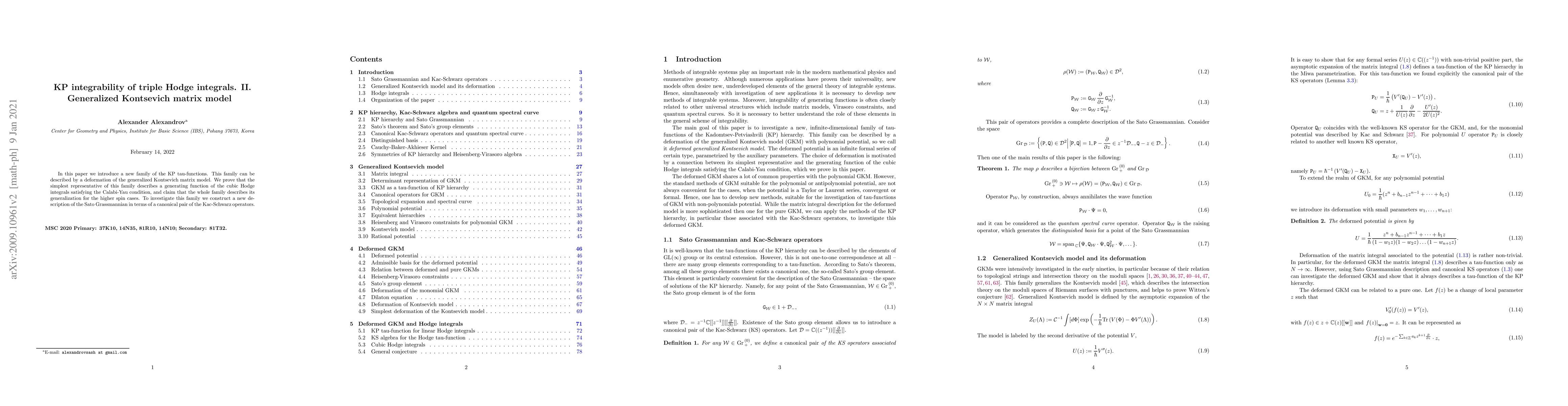 In this paper we introduce a new family of the KP tau-functions. This family can be described by a deformation of the generalized Kontsevich matrix model. We prove that the simplest representative of this family describes a generating function of the cubic Hodge integrals satisfying the Calabi-Yau condition, and claim that the whole family describes its generalization for the higher spin cases. To investigate this family we construct a new description of the Sato Grassmannian in terms of a canonical pair of the Kac-Schwarz operators.