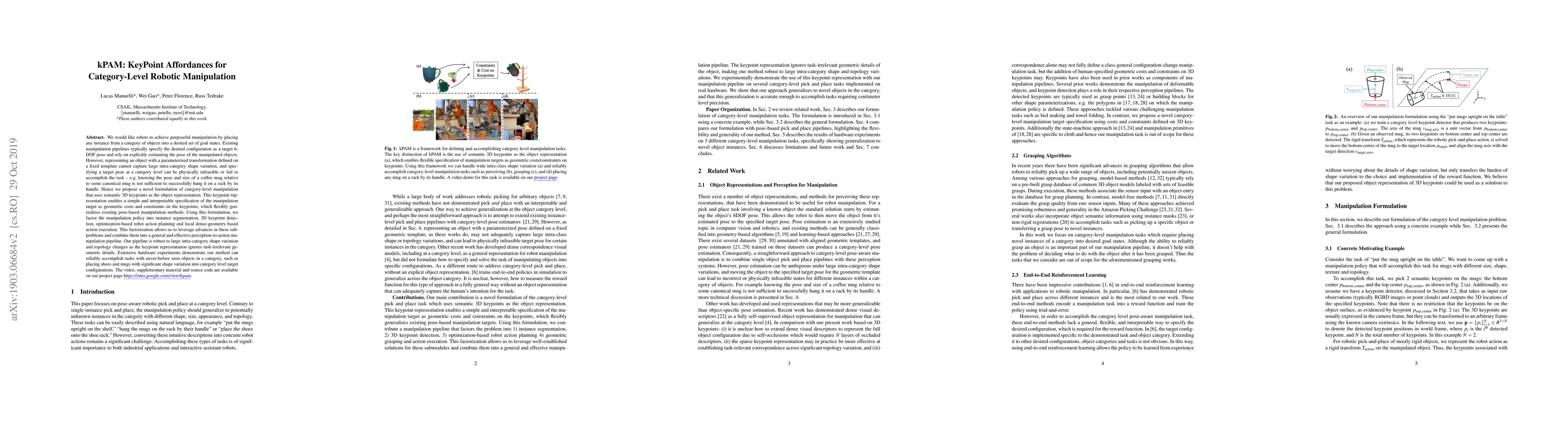 The paper proposes kPAM, a novel framework for category-level robotic manipulation using semantic 3D keypoints instead of fixed pose representations to handle large intra-category shape variations. The method factors manipulation into instance segmentation, keypoint detection, optimization-based planning, and dense-geometry execution, demonstrating robust performance on tasks with previously unseen objects.