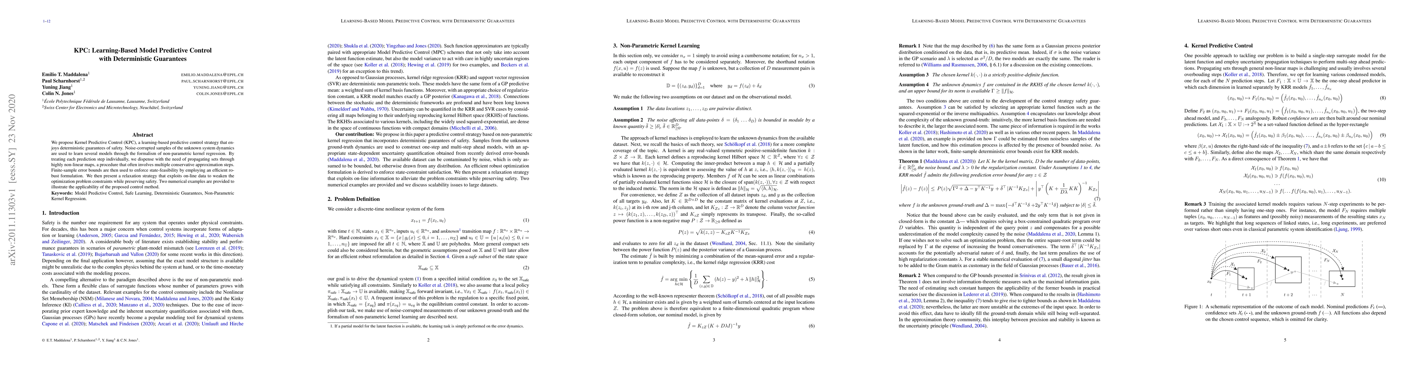 The paper introduces Kernel Predictive Control (KPC), a learning-based model predictive control method that ensures deterministic safety guarantees. It leverages non-parametric kernel regression to learn system dynamics and employs finite-sample error bounds to enforce state-feasibility, avoiding conservative approximations.