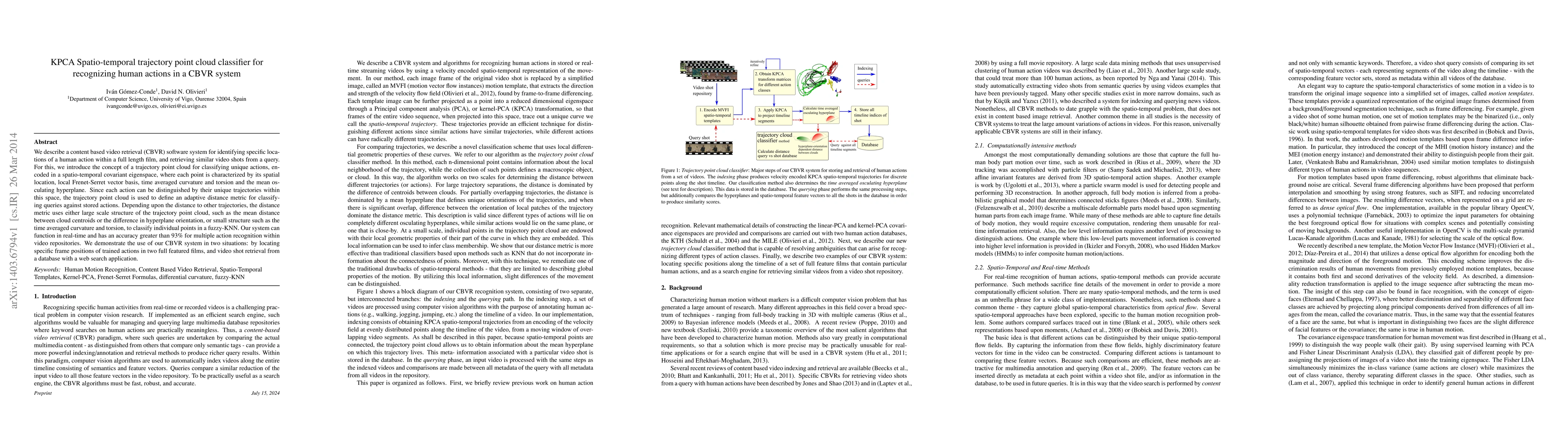 We describe a content based video retrieval (CBVR) software system for identifying specific locations of a human action within a full length film, and retrieving similar video shots from a query. For this, we introduce the concept of a trajectory point cloud for classifying unique actions, encoded in a spatio-temporal covariant eigenspace, where each point is characterized by its spatial location, local Frenet-Serret vector basis, time averaged curvature and torsion and the mean osculating hyperplane. Since each action can be distinguished by their unique trajectories within this space, the trajectory point cloud is used to define an adaptive distance metric for classifying queries against stored actions. Depending upon the distance to other trajectories, the distance metric uses either large scale structure of the trajectory point cloud, such as the mean distance between cloud centroids or the difference in hyperplane orientation, or small structure such as the time averaged curvature and torsion, to classify individual points in a fuzzy-KNN. Our system can function in real-time and has an accuracy greater than 93% for multiple action recognition within video repositories. We demonstrate the use of our CBVR system in two situations: by locating specific frame positions of trained actions in two full featured films, and video shot retrieval from a database with a web search application.