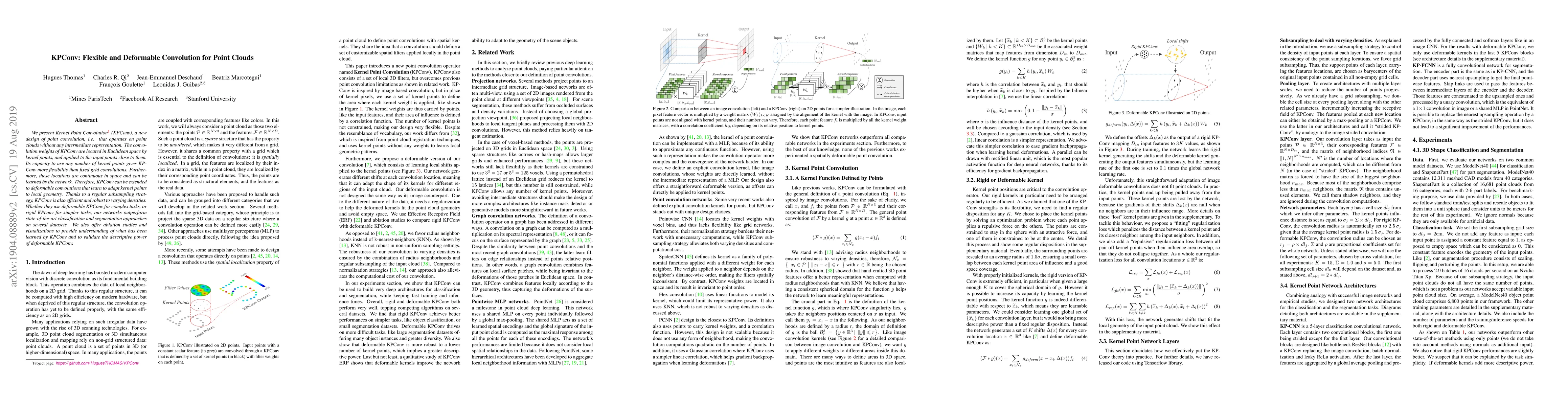 We present Kernel Point Convolution (KPConv), a new design of point convolution, i.e. that operates on point clouds without any intermediate representation. The convolution weights of KPConv are located in Euclidean space by kernel points, and applied to the input points close to them. Its capacity to use any number of kernel points gives KPConv more flexibility than fixed grid convolutions. Furthermore, these locations are continuous in space and can be learned by the network. Therefore, KPConv can be extended to deformable convolutions that learn to adapt kernel points to local geometry. Thanks to a regular subsampling strategy, KPConv is also efficient and robust to varying densities. Whether they use deformable KPConv for complex tasks, or rigid KPconv for simpler tasks, our networks outperform state-of-the-art classification and segmentation approaches on several datasets. We also offer ablation studies and visualizations to provide understanding of what has been learned by KPConv and to validate the descriptive power of deformable KPConv.