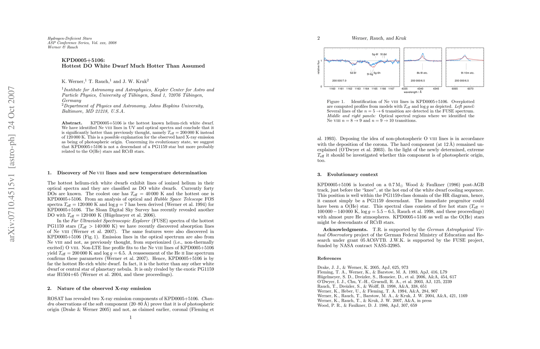 KPD0005+5106 is the hottest known helium-rich white dwarf. We have identified NeVIII lines in UV and optical spectra and conclude that it is significantly hotter than previously thought, namely Teff=200,000 K instead of 120,000 K. This is a possible explanation for the observed hard X-ray emission as being of photospheric origin. Concerning its evolutionary state, we suggest that KPD0005+5106 is not a descendant of a PG1159 star but more probably related to the O(He) stars and RCrB stars.