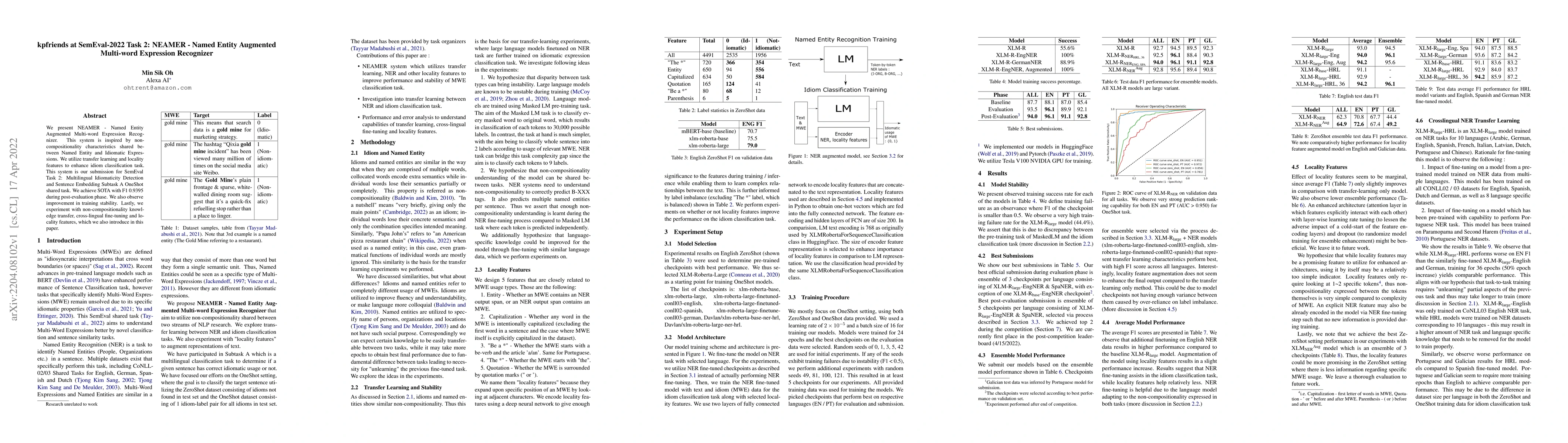 The paper introduces NEAMER, a Named Entity Augmented Multi-word Expression Recognizer, which leverages transfer learning and locality features to improve idiom classification. The system achieves state-of-the-art results with an F1 score of 0.9395 in SemEval-2022 Task 2, demonstrating enhanced training stability and exploring non-compositionality knowledge transfer and cross-lingual fine-tuning.