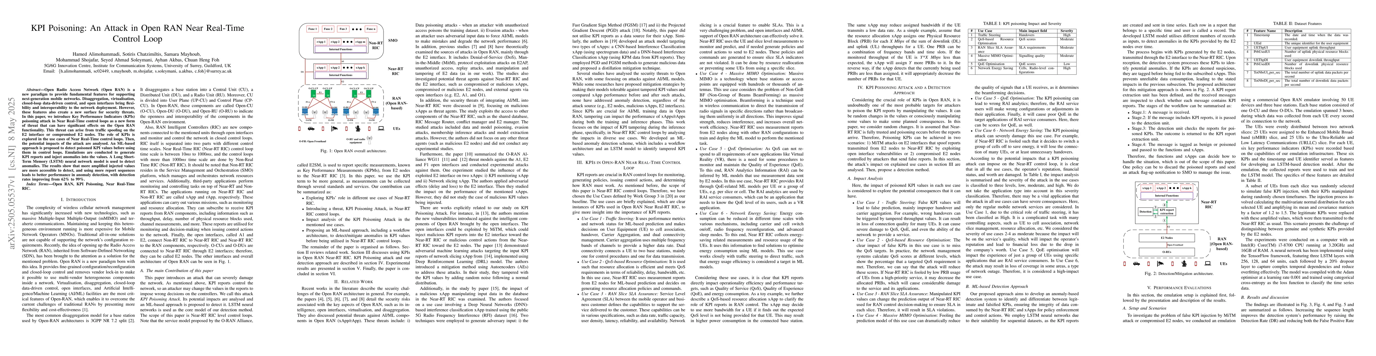 Researchers introduce a new security threat in Open RAN near real-time control loops called KPI poisoning, which can significantly impact network functionality. An ML-based approach is proposed to detect poisoned KPI values using an LSTM neural network model.