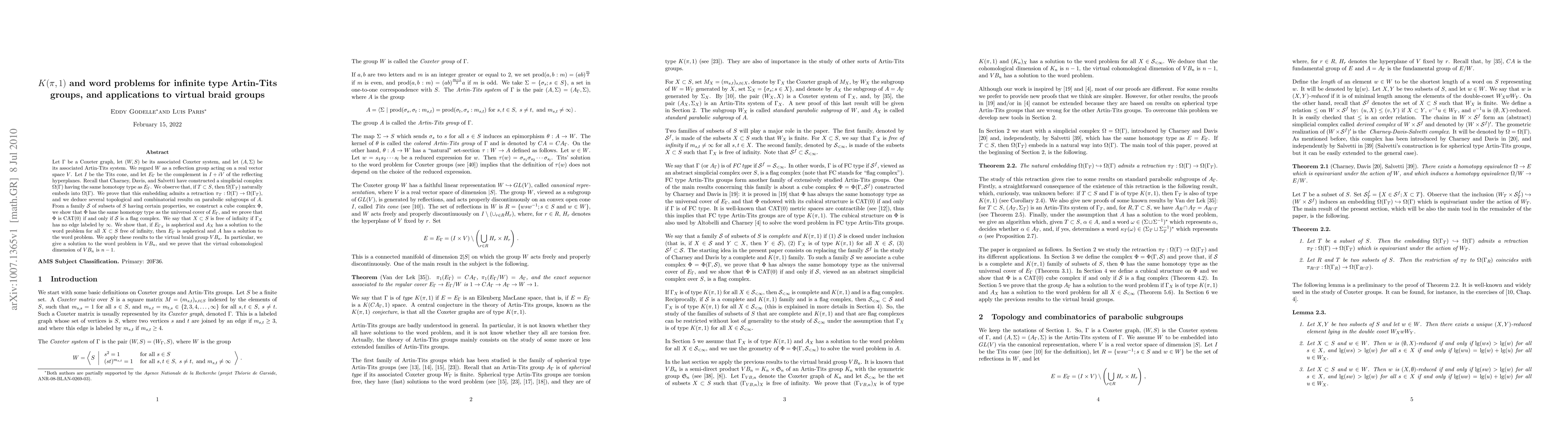 Let $\Gamma$ be a Coxeter graph, let $(W,S)$ be its associated Coxeter system, and let $(A,\Sigma$) be its associated Artin-Tits system. We regard $W$ as a reflection group acting on a real vector space $V$. Let $I$ be the Tits cone, and let $E_\Gamma$ be the complement in $I +iV$ of the reflecting hyperplanes. Recall that Charney, Davis, and Salvetti have constructed a simplicial complex $\Omega(\Gamma)$ having the same homotopy type as $E_\Gamma$. We observe that, if $T \subset S$, then $\Omega(\Gamma_T)$ naturally embeds into $\Omega (\Gamma)$. We prove that this embedding admits a retraction $\pi_T: \Omega(\Gamma) \to \Omega (\Gamma_T)$, and we deduce several topological and combinatorial results on parabolic subgroups of $A$. From a family $\SS$ of subsets of $S$ having certain properties, we construct a cube complex $\Phi$, we show that $\Phi$ has the same homotopy type as the universal cover of $E_\Gamma$, and we prove that $\Phi$ is CAT(0) if and only if $\SS$ is a flag complex. We say that $X \subset S$ is free of infinity if $\Gamma_X$ has no edge labeled by $\infty$. We show that, if $E_{\Gamma_X}$ is aspherical and $A_X$ has a solution to the word problem for all $X \subset S$ free of infinity, then $E_\Gamma$ is aspherical and $A$ has a solution to the word problem. We apply these results to the virtual braid group $VB_n$. In particular, we give a solution to the word problem in $VB_n$, and we prove that the virtual cohomological dimension of $VB_n$ is $n-1$.