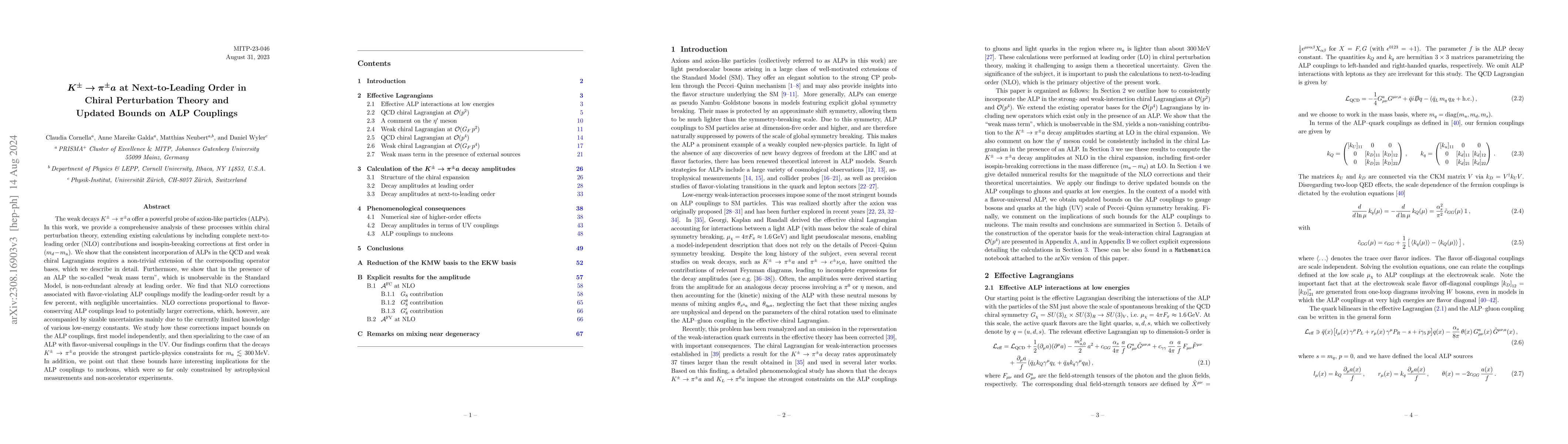This paper analyzes the weak decays $K^\pm\to\pi^\pm a$ within next-to-leading order chiral perturbation theory, revealing that NLO corrections modify leading-order results by a few percent. It updates bounds on axion-like particle (ALP) couplings, confirming that these decays provide the strongest constraints for $m_a\lesssim 300$ MeV and highlighting implications for ALP couplings to nucleons.