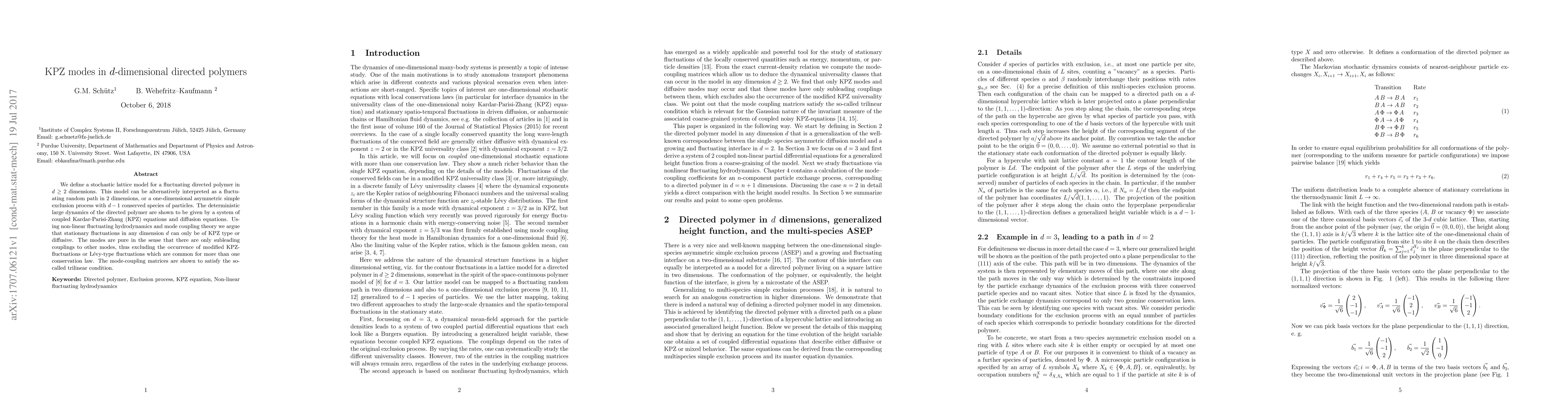We define a stochastic lattice model for a fluctuating directed polymer in $d\geq 2$ dimensions. This model can be alternatively interpreted as a fluctuating random path in 2 dimensions, or a one-dimensional asymmetric simple exclusion process with $d-1$ conserved species of particles. The deterministic large dynamics of the directed polymer are shown to be given by a system of coupled Kardar-Parisi-Zhang (KPZ) equations and diffusion equations. Using non-linear fluctuating hydrodynamics and mode coupling theory we argue that stationary fluctuations in any dimension $d$ can only be of KPZ type or diffusive. The modes are pure in the sense that there are only subleading couplings to other modes, thus excluding the occurrence of modified KPZ-fluctuations or L\'evy-type fluctuations which are common for more than one conservation law. The mode-coupling matrices are shown to satisfy the so-called trilinear condition.