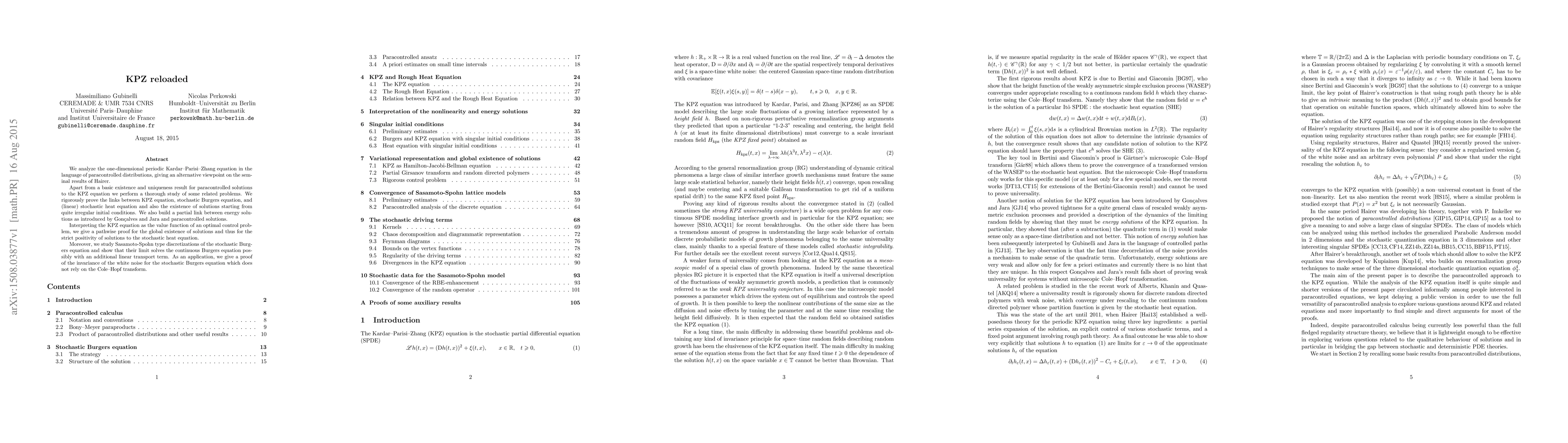 This paper provides a novel analysis of the one-dimensional periodic Kardar-Parisi-Zhang (KPZ) equation using paracontrolled distributions, establishing existence and uniqueness of paracontrolled solutions and linking it to stochastic Burgers and heat equations. It also proves the global existence of solutions via an optimal control interpretation.