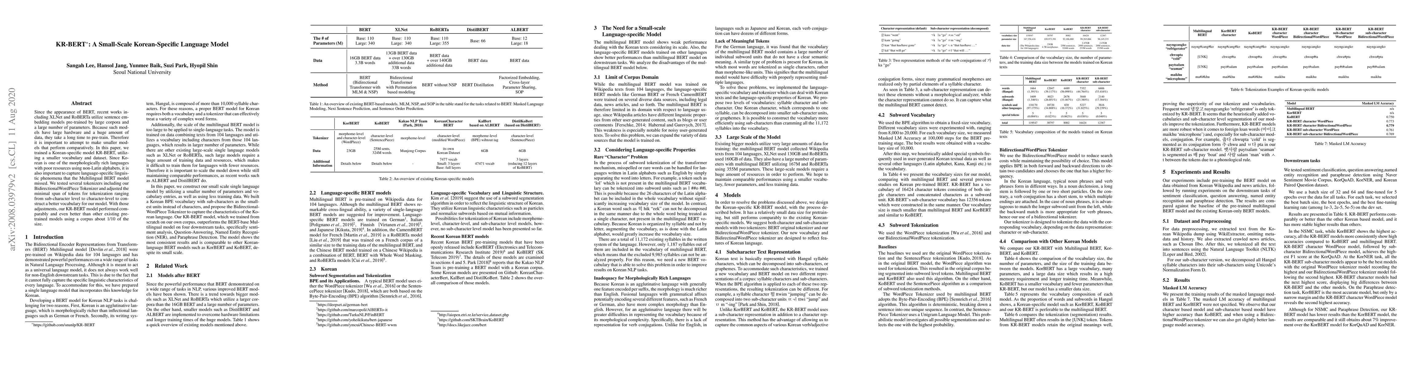 This paper introduces KR-BERT, a small-scale Korean-specific language model designed to address the challenges of morphologically rich languages with limited resources. The authors tested various tokenizers and tokenization spans to construct an effective vocabulary, resulting in a model that performs comparably to larger models using a significantly smaller dataset.