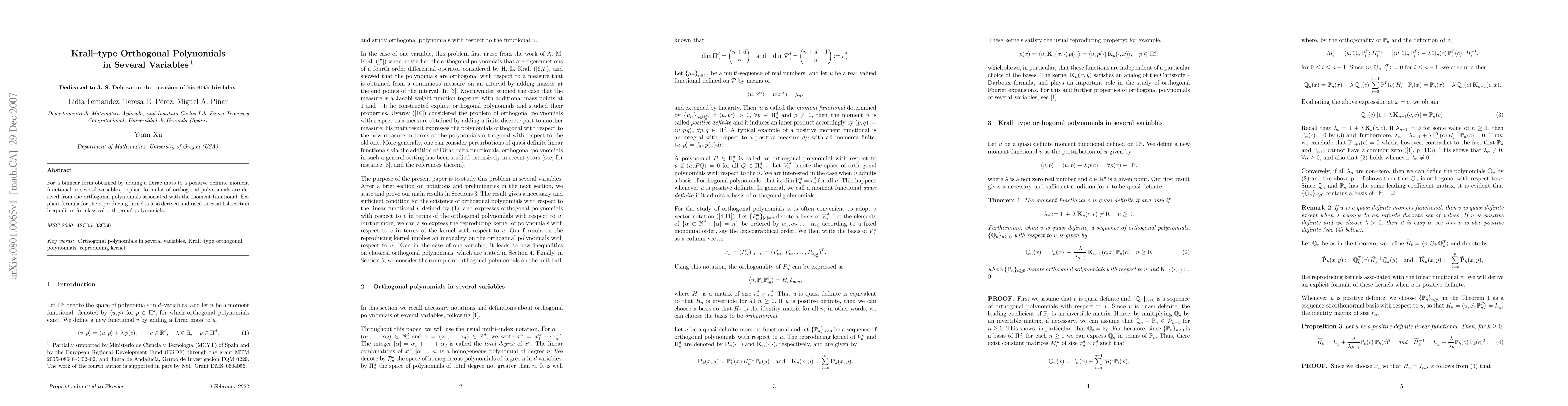 This paper derives explicit formulas for Krall-type orthogonal polynomials in several variables from moment functionals, including a Dirac mass, and presents an explicit formula for their reproducing kernel to establish inequalities for classical orthogonal polynomials.