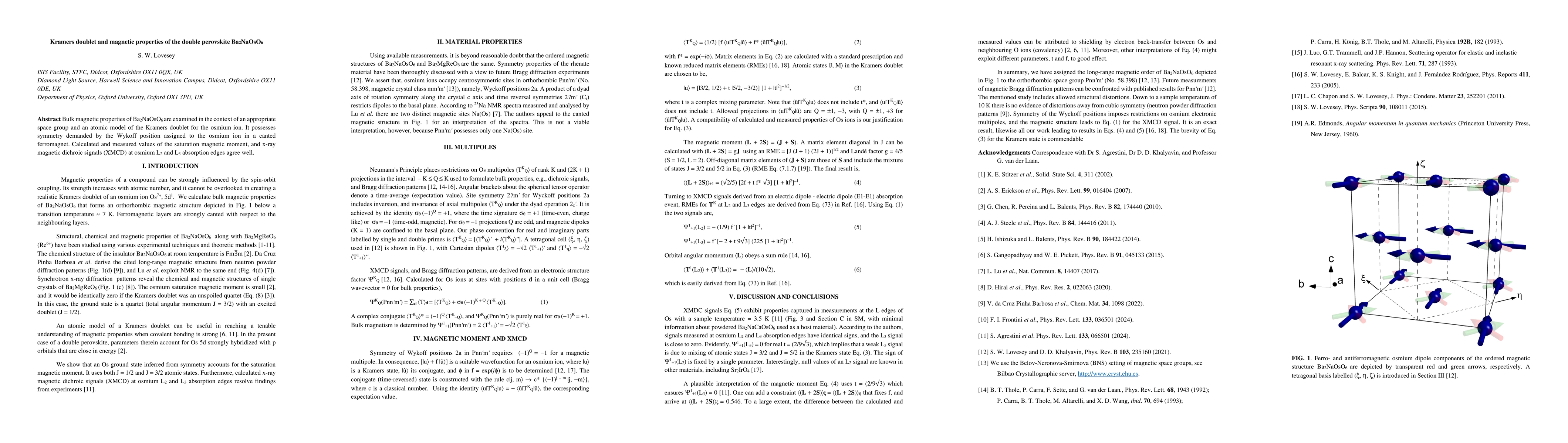 The study investigates the bulk magnetic properties of Ba2NaOsO6 within a specified space group and atomic model, revealing a Kramers doublet for the osmium ion, consistent with canted ferromagnet symmetry, with good agreement between calculated and measured magnetic moment and XMCD signals.