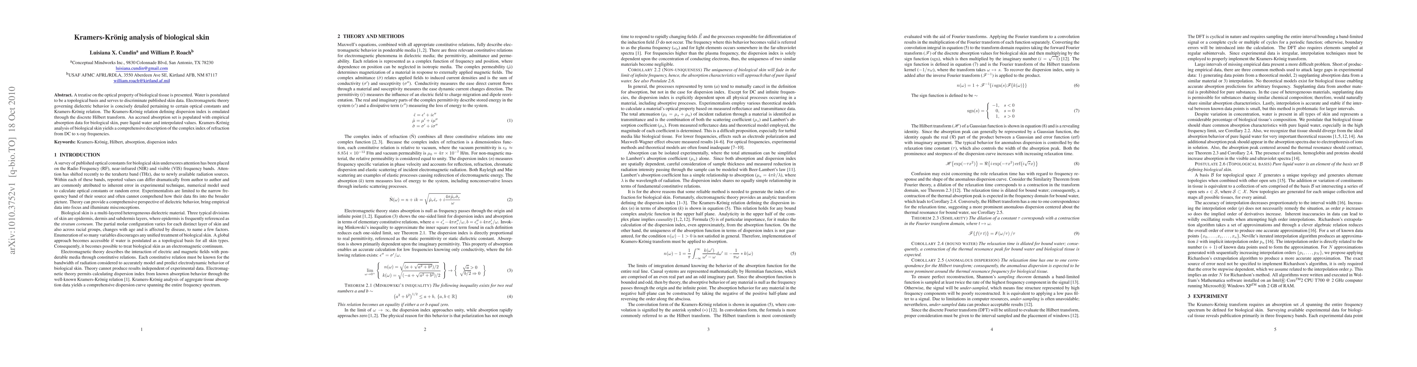 This paper uses Kramers-Kronig analysis to study the optical properties of biological skin, revealing a comprehensive description of its complex index of refraction across DC to x-ray frequencies.