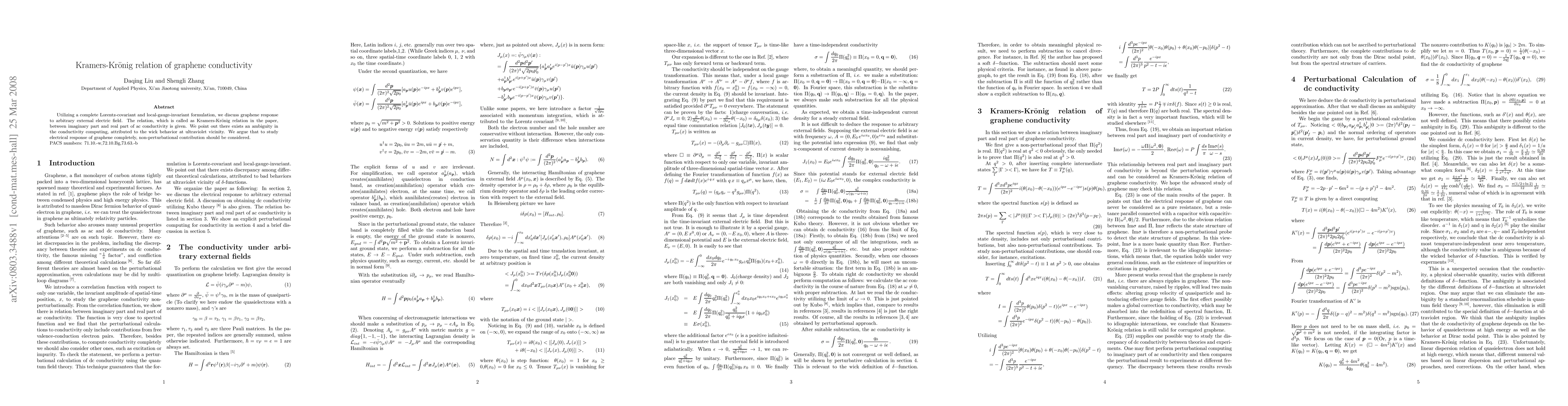 Utilizing a complete Lorentz-covariant and local-gauge-invariant formulation, we discuss graphene response to arbitrary external electric field. The relation, which is called as Kramers-Kr(\ddot{o})nig relation in the paper, between imaginary part and real part of ac conductivity is given. We point out there exists an ambiguity in the conductivity computing, attributed to the wick behavior at ultraviolet vicinity. We argue that to study electrical response of graphene completely, non-perturbational contribution should be considered.