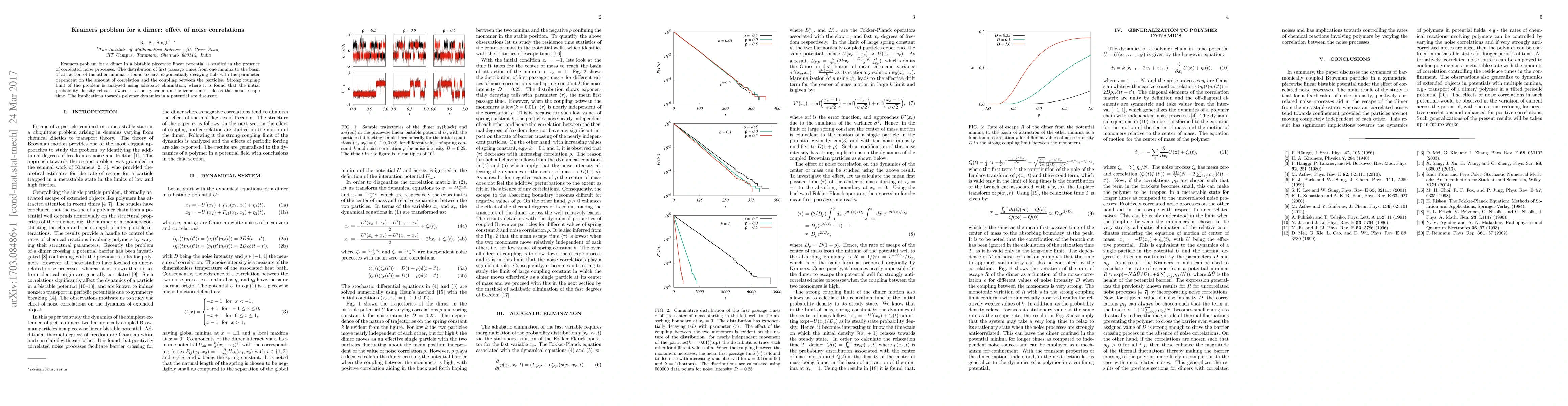 Kramers problem for a dimer in a bistable piecewise linear potential is studied in the presence of correlated noise processes. The distribution of first passage times from one minima to the basin of attraction of the other minima is found to have exponentially decaying tails with the parameter dependent on the amount of correlation and the coupling between the particles. Strong coupling limit of the problem is analyzed using adiabatic elimination, where it is found that the initial probability density relaxes towards stationary value on the same time scale as the mean escape time. The implications towards polymer dynamics in a potential are discussed.