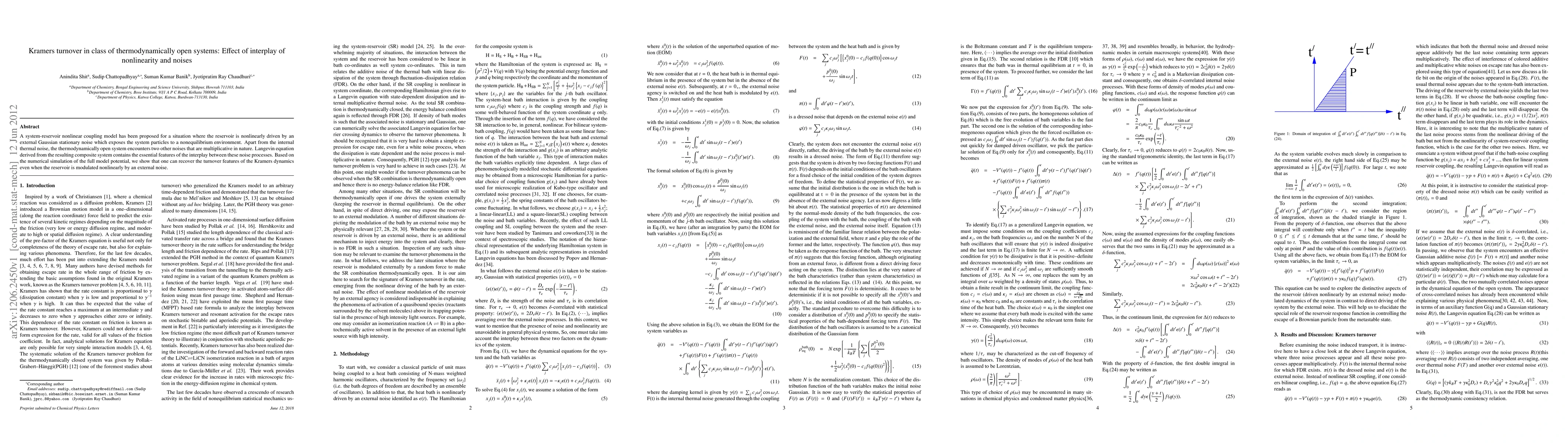 A system-reservoir nonlinear coupling model has been proposed for a situation where the reservoir is nonlinearly driven by an external Gaussian stationary noise which exposes the system particles to a nonequilibrium environment. Apart from the internal thermal noise, the thermodynamically open system encounters two other noises that are multiplicative in nature. Langevin equation derived from the resulting composite system contains the essential features of the interplay between these noise processes. Based on the numerical simulation of the full model potential, we show that one can recover the turnover features of the Kramers dynamics even when the reservoir is modulated nonlinearly by an external noise.