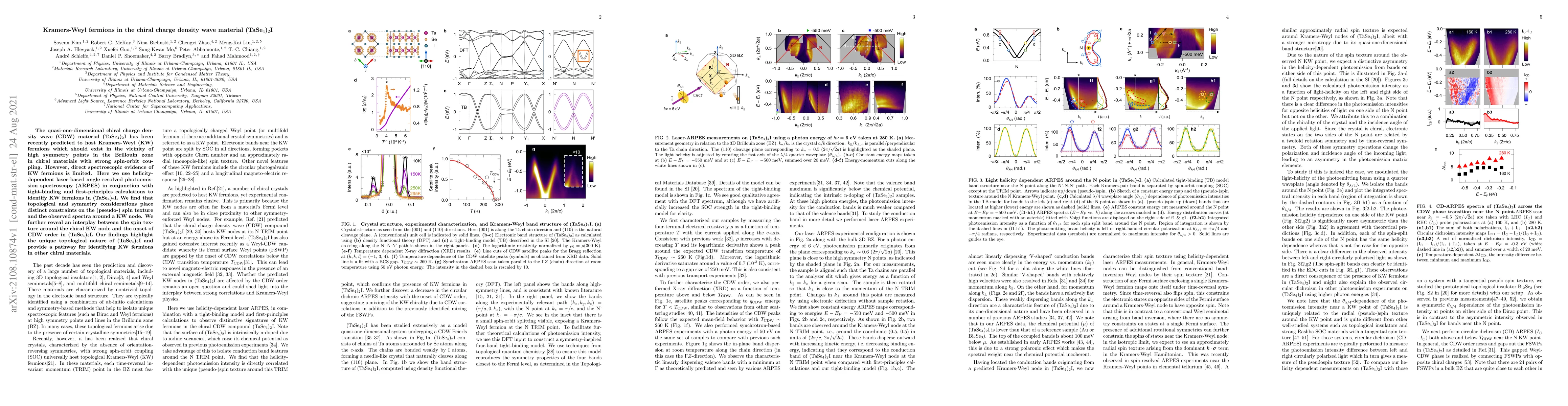 This study identifies Kramers-Weyl fermions in the chiral charge density wave material (TaSe$_4$)$_2$I using laser-based ARPES, revealing their unique topological spin texture and interplay with CDW order, offering insights for identifying similar fermions in other chiral materials.