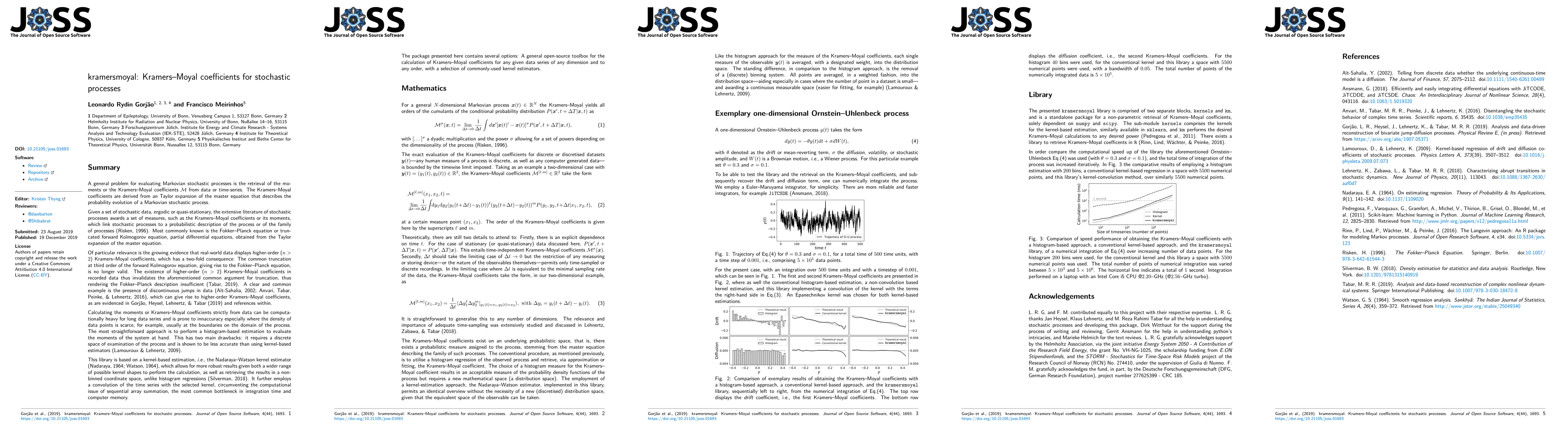 Summary: The kramersmoyal Python library extracts Kramers-Moyal coefficients from multidimensional stochastic timeseries using non-parametric Nadaraya-Watson estimators to determine drift, diffusion, and higher-order moments. It is applicable to timeseries of any dimension and order.