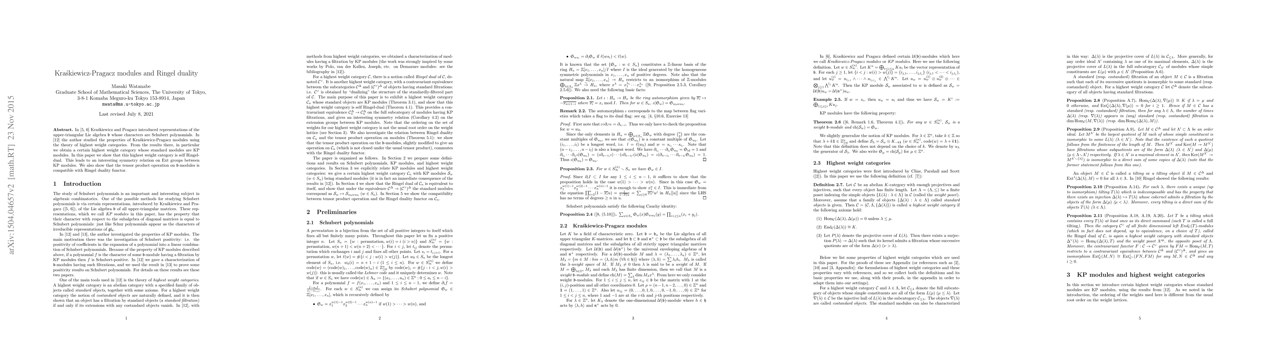 Kra\'skiewicz and Pragacz introduced representations of the upper-triangular Lie algebras whose characters are Schubert polynomials. In a previous work the author studied the structure of Kra\'skiewicz-Pragacz modules using the theory of highest weight categories. From the results there, in particular we obtain a certain highest weight category whose standard modules are KP modules. In this paper we show that this highest weight category is self Ringel-dual: this leads to an interesting symmetry relation on Ext groups between KP modules. We also show that the tensor product operation on b-modules is compatible with Ringel duality functor.