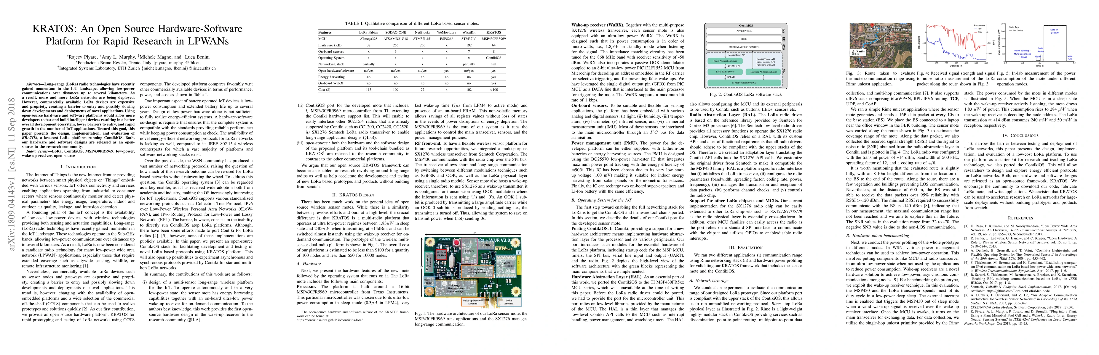 KRATOS is an open-source hardware-software platform designed to facilitate rapid research in low-power wide-area networks (LPWANs) using LoRa technology. It aims to lower barriers to entry for developers by providing a low-cost, open-source alternative to proprietary LoRa devices.