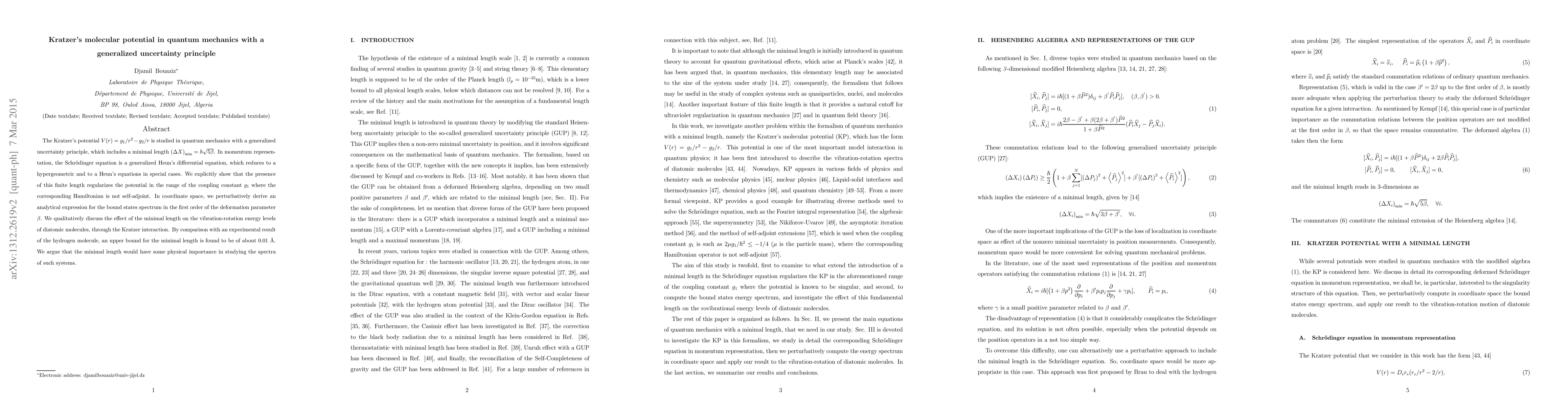 The Kratzer's potential $V(r)=g_{1}/r^{2}-g_{2}/r$ is studied in quantum mechanics with a generalized uncertainty principle, which includes a minimal length $\left( \Delta X\right) _{\min}=\hbar\sqrt{5\beta}$. In momentum representation, the Schr\"{o}dinger equation is a generalized Heun's differential equation, which reduces to a hypergeometric and to a Heun's equations in special cases. We explicitly show that the presence of this finite length regularizes the potential in the range of the coupling constant $g_{1}$ where the corresponding Hamiltonian is not self-adjoint. In coordinate space, we perturbatively derive an analytical expression for the bound states spectrum in the first order of the deformation parameter $\beta$. We qualitatively discuss the effect of the minimal length on the vibration-rotation energy levels of diatomic molecules, through the Kratzer interaction. By comparison with an experimental result of the hydrogen molecule, an upper bound for the minimal length is found to be of about $0.01$ \AA . We argue that the minimal length would have some physical importance in studying the spectra of such systems