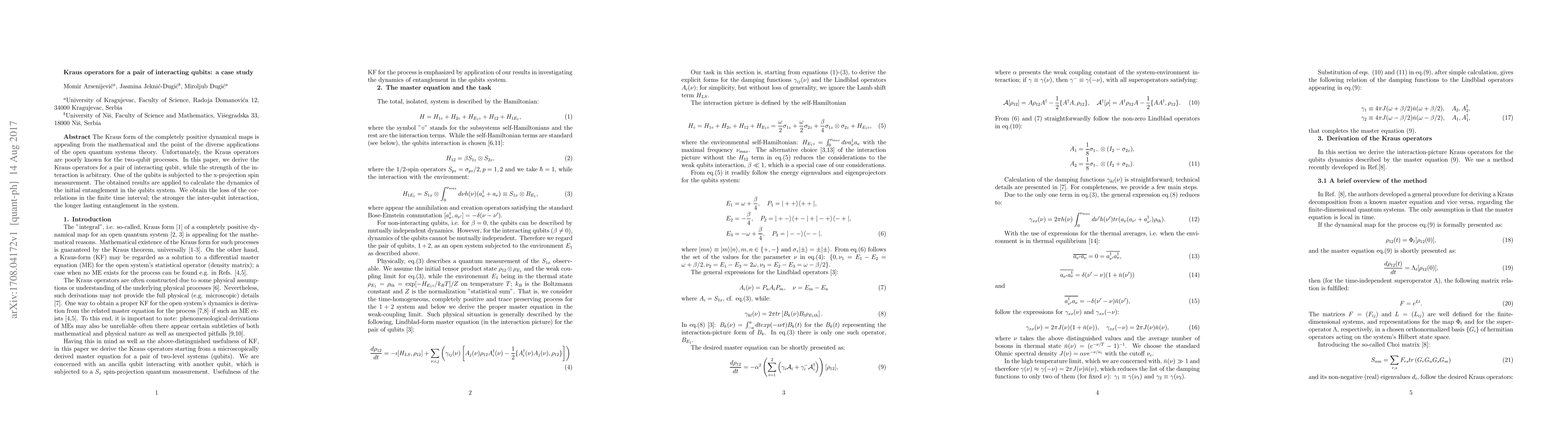 The Kraus form of the completely positive dynamical maps is appealing from the mathematical and the point of the diverse applications of the open quantum systems theory. Unfortunately, the Kraus operators are poorly known for the two-qubit processes. In this paper, we derive the Kraus operators for a pair of interacting qubit, while the strength of the interaction is arbitrary. One of the qubits is subjected to the x-projection spin measurement. The obtained results are applied to calculate the dynamics of the initial entanglement in the qubits system. We obtain the loss of the correlations in the finite time interval; the stronger the inter-qubit interaction, the longer lasting entanglement in the system.