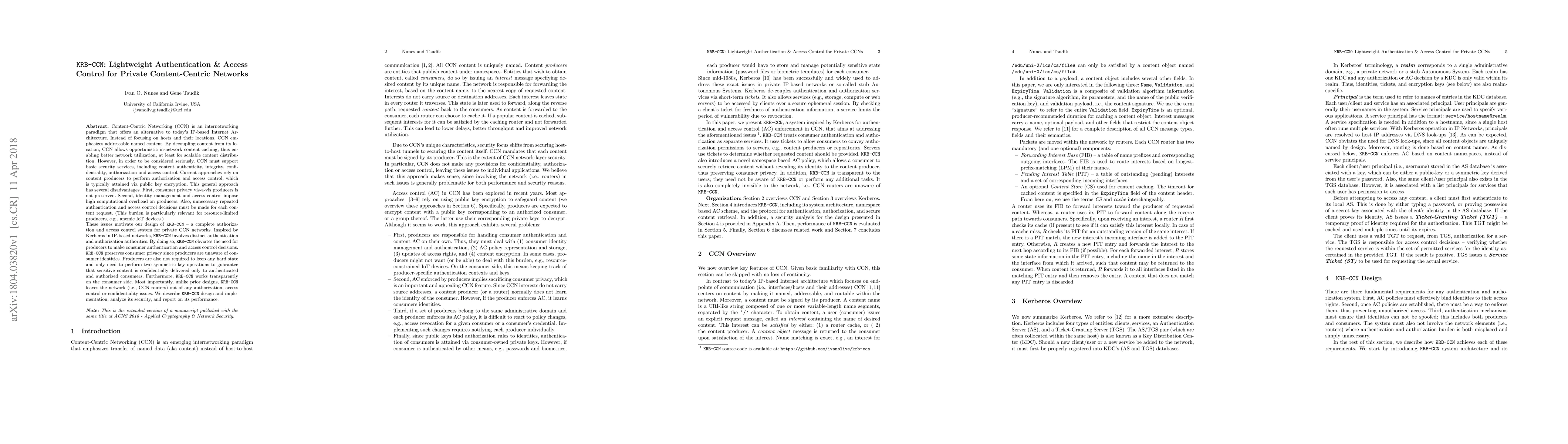 KRB-CCN presents a lightweight authentication and access control system for private Content-Centric Networks, inspired by Kerberos, which separates authentication and authorization from content producers, thus preserving consumer privacy and reducing computational overhead. The system ensures content confidentiality and access control without involving network routers.