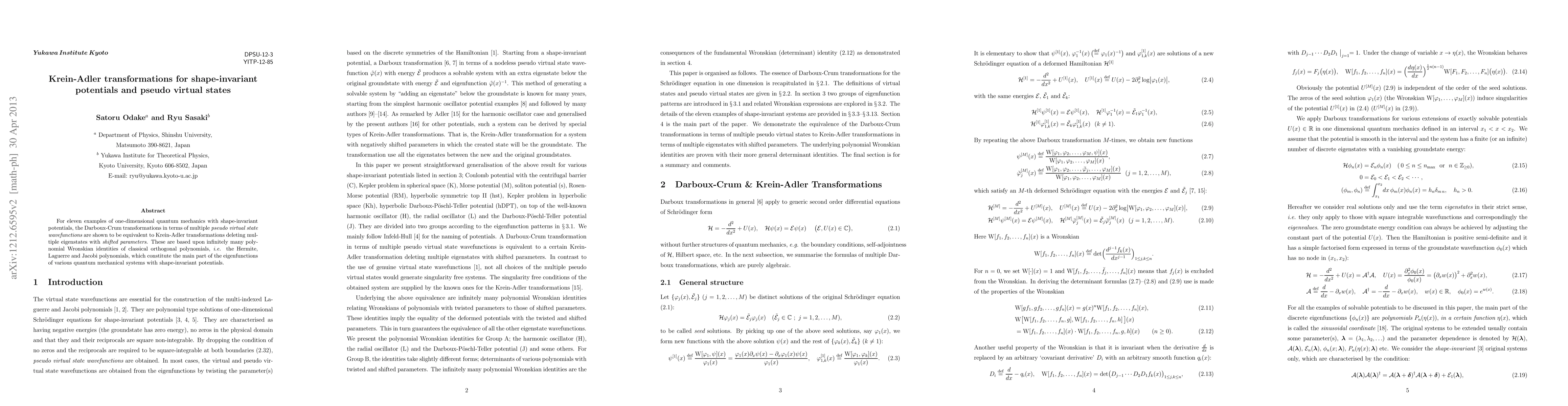 This paper demonstrates that Darboux-Crum transformations for shape-invariant potentials in one-dimensional quantum mechanics are equivalent to Krein-Adler transformations, both utilizing multiple pseudo virtual state wavefunctions. The equivalence is underpinned by polynomial Wronskian identities from classical orthogonal polynomials like Hermite, Laguerre, and Jacobi.