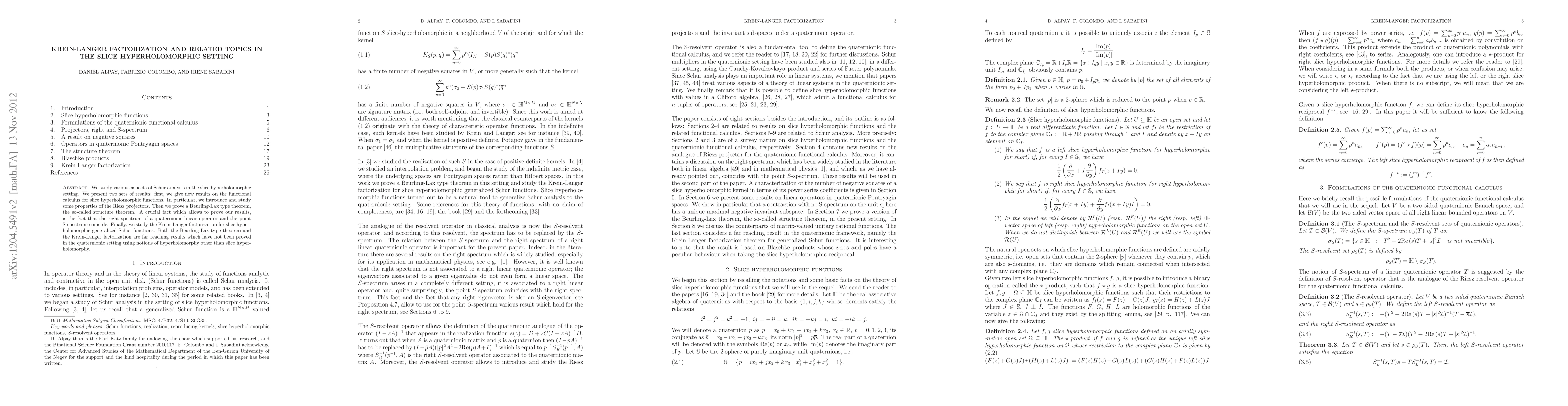 The paper introduces and analyzes Riesz projectors in the slice hyperholomorphic setting, proves a Beurling-Lax type theorem, and establishes the coincidence of the right spectrum and S-spectrum for quaternionic linear operators, leading to the Krein-Langer factorization for slice hyperholomorphic generalized Schur functions.
