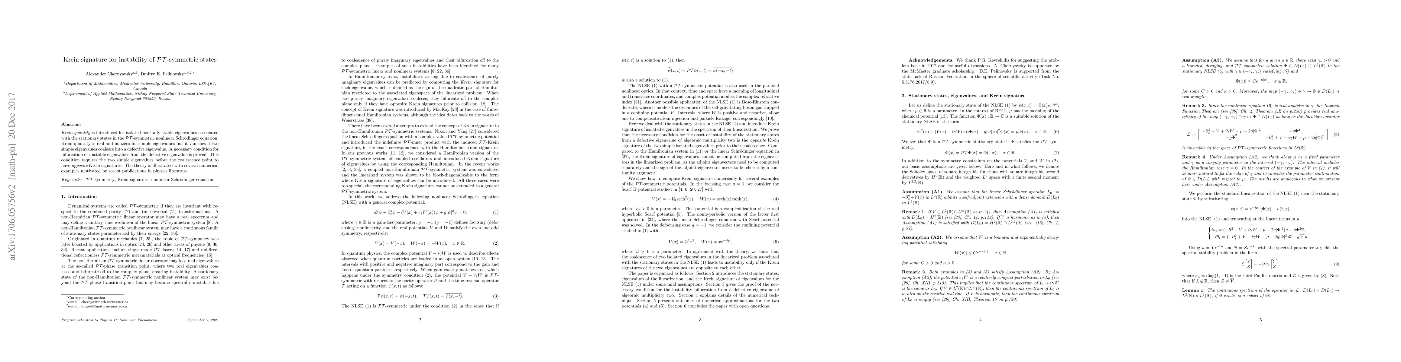 Researchers introduced a Krein quantity to measure instability in $ extit{PT}$-symmetric states, finding that opposite signatures from two coalescing eigenvalues can trigger bifurcation into unstable states.