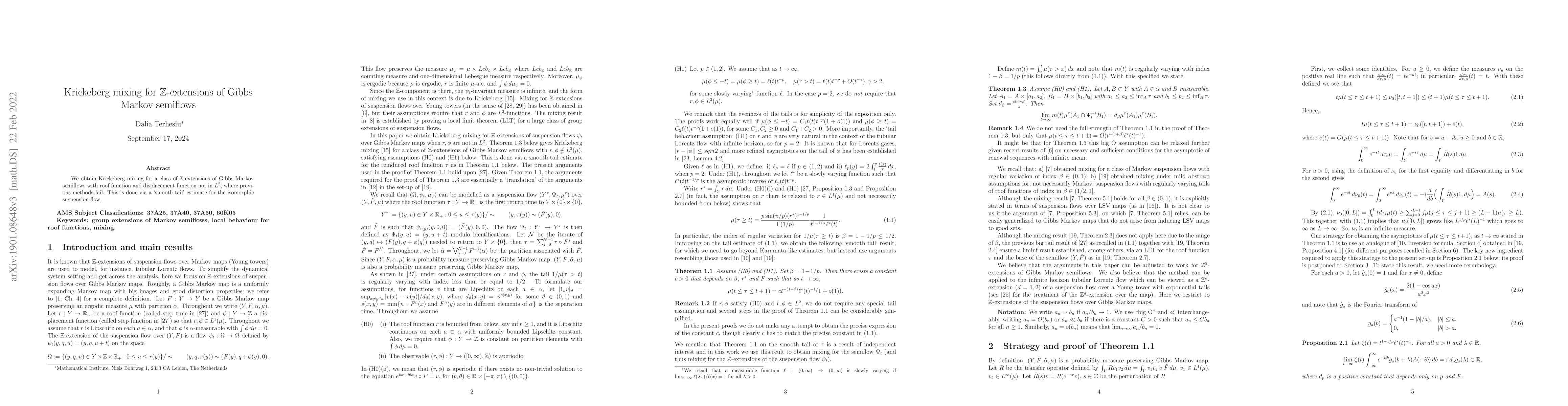 This research introduces Krickeberg mixing for specific Z extensions of Gibbs Markov semiflows, achieving this without the usual L2 conditions for roof and displacement functions. It employs a 'smooth tail' estimate for the isomorphic suspension flow, expanding applicable conditions for such systems.